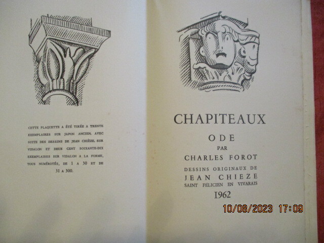 Saint Félicien en Vivarais, 1962; plaquette in-8° en feuilles, couverture crème rempliée avec titre en noir et rouge et vignette en noir au 1er plat , dos muet ; 21pp., 1f.; 17 dessins de chapiteaux en noir dans le texte par jean Chièze.Couverture un peu insolée.