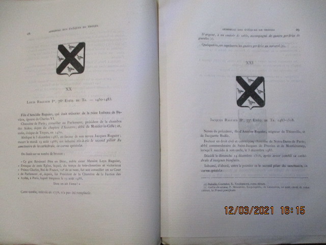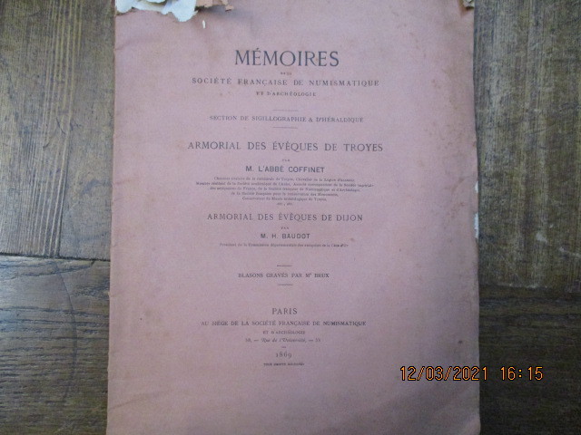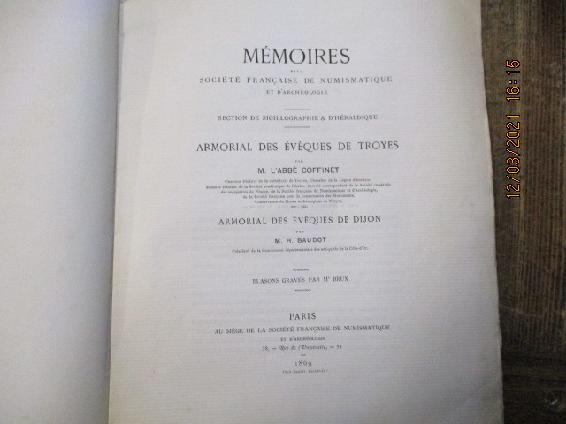 1869 Paris, Au siège de la société française de numismatique, 1869. In-4 broché, V-77 pages sur papier vergé. 41 blasons pour l'armorial des évêques de Troyes et 12 pour celui de Dijon (gravés par BRUX).