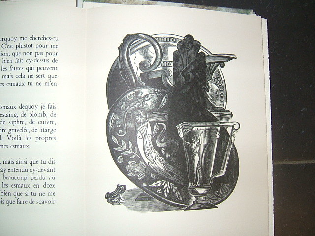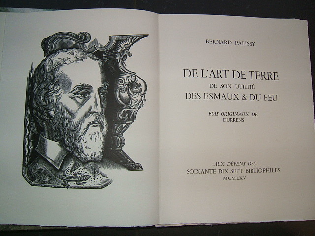 1965 Paris, Aux Dépens des Soixante-dix-sept bibliophiles, 1965. In-folio en feuilles sous couverture rempliée, chemise dos lisse demi basane verte avec une plaque d'émail incrustée (portrait de Palissy), titre doré et étui, 103 pages plus justification du tirage et achevé d'imprimer. 15 bois gravés à pleine page de DURRENS. Tirage limité à 77 exemplaires Sur vélin de Rives tous numérotés à la presse et signés par l'artiste et comportant chacun une double suite des gravures sur Rives, et sur Vidalon ancien.