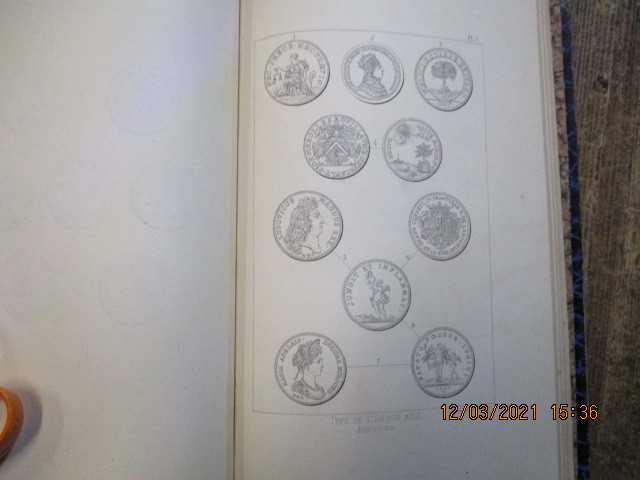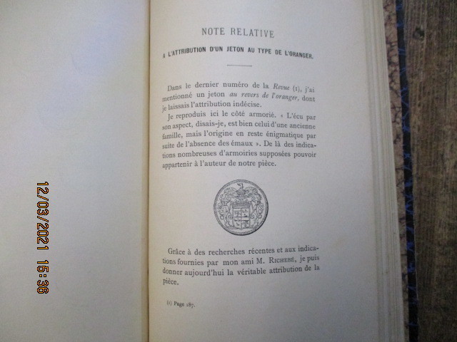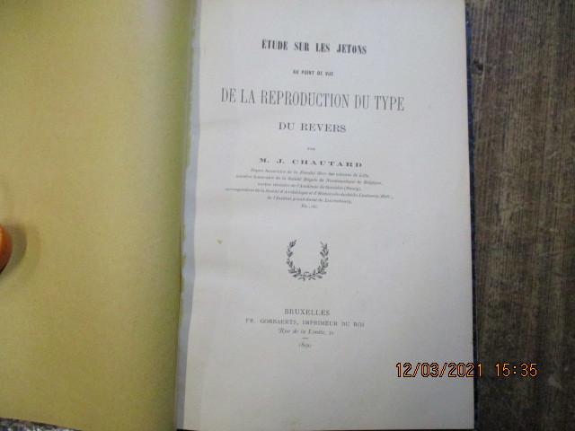 Reliure époque demi basane ardoise, dos lisse, titre doré. Six textes format in-8. Premier texte : Etude sur les jetons au point de vue de la reproduction du type du revers. Bruxelles, Gobbaerts, 1890, 87 pages cinq planches hors-texte en fin de volume montées sur onglet. Deuxième texte : Note relative à l'attribution d'un jeton au type de l'oranger. 1891, 4 pages. troisième texte : Jeton anépigraphe d'un membre de la famille de Langheac. 1895, 4 pages. troisième texte : Nouveau jeton au type de l'oranger de la famille de Langheac. 1896., 5 pages. Quatrième texte : Quelques sceaux, jetons et armoiries concernant les corporations de médeciens, chirurgiens, barbiers aux XVII° et XVIII° siècles. 1896, 14 pages, une planche hors-texte. Cinquième texte : Notice sur henri de bourbon marquis de Verneuil, évêque de Metz et sur son suffrageant nicolas Coeffeteau à l'occasion d'un jeton frappé aux noms de ces deux personnages. 1897, 15 pages, trois planches hors-texte. sixième texte : de la préparation et de la conservation des empreintes de monnaies et jetons ; essai de classificatios à suivre dans l'étude des jetons français. 1895, 12 pages.