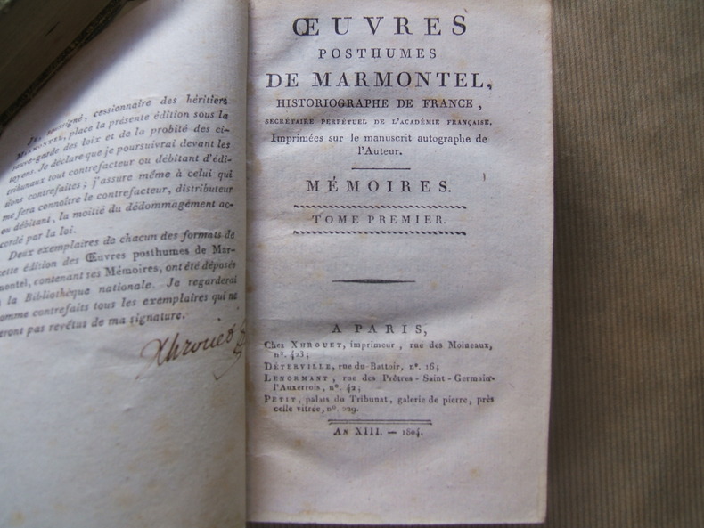 1804 Paris, Xhrouet, 1804 (an 13). Quatre tomes en deux volumes in-12, 394--328-352-341 pages. Reliure époque demi veau blond, dos lisse, faux nerfs et fleurons dorés, pièce de titre maroquin rouge, titre or. "Les mémoires de Marmontel, incontestablement son chef-doeuvre, sont considérés comme un document important pour lhistoire de la littérature et de la société française au XVIII° siècle ». Mors fragiles dont deux partiellemnt fendus.