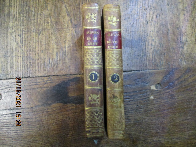 1821 Privas, Baudouin frères, 1821. 2 volumes in-16, XI-270 ey 224 pages. Reliure époque demi basane blonde, dos lisse, faux nerfs, caissons et treillis dorés, pièce de titre maroquin rouge, de tomaison maroquin vert (ronde), titre or. Contient : les odes ; Elégies ; Epitres ; les vieillées du Parnasse ; la nature et épigrammes. portrait frontispice gravé par Ambroise Tardieu.