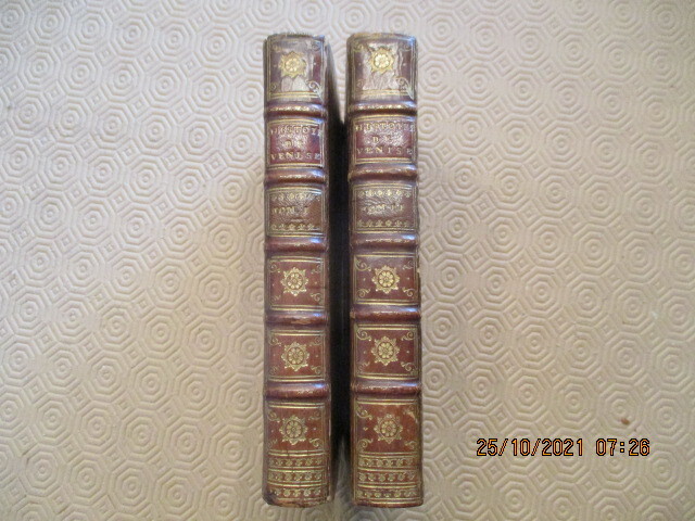Relié avec "Examen de la liberté originaire de Venise". Traduit de l'italien avec une harange de Louis Hélian, traduite du latin. Et des notes. A Ratisbonne, chez Jean Aubri, 1684. 184 pages. Reliure époque plein veau tabac, dos à nerfs orné de caissons et fleurons, dorés, pièce de titre maroquin rouge, pièce de tomaison maroquin rouge, titre doré… T.2 : dos un peu frotté en pied. ex-libris sur étiquette imprimée "Levrier".