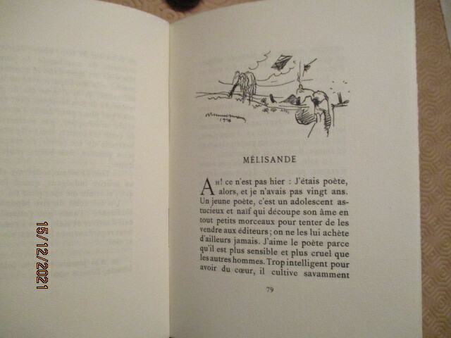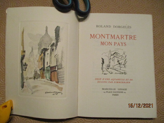 1928 broché (paperback) grand in-octavo carré, dos muet (spine - no title) crème, première de couverture rempliée ornée d'une petite illustration en cul-de-lampe (front cover illuminated with small illustration in tailpiece), tranches non rognées (edges no smoothes), envoi autographe manuscrit de l'Auteur sur la page de faux-titre (author's autograph on the half title page), tirage limité (limited edition), illustrations : 1 aquarelle en frontispice (watercolour in frontispiece) et de dessins (drawings) de Zimmermann, 91 pages, 1928 à Paris Marcelle Lesage,