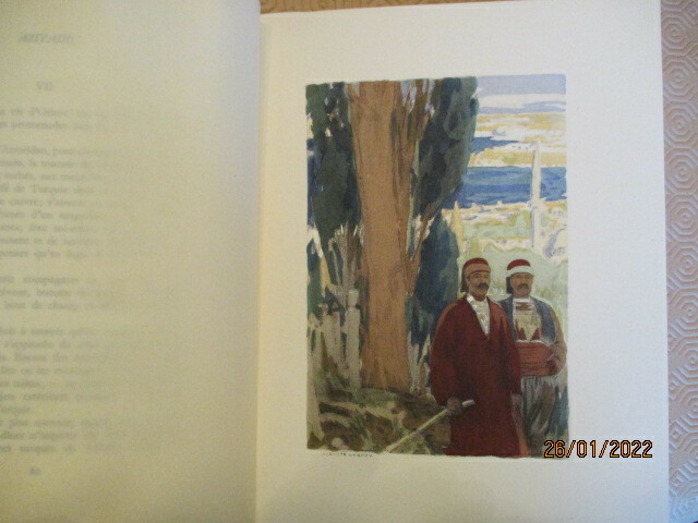 Comme beaucoup d'autres romans de Pierre Loti,l'histoire est liée à une affectation militaire de l'écrivain voyageur. Premier roman, Aziyadé, évoque pour nous les charmes surannés de l'exotisme. Les oeuvres de Loti n'ont pas vieilli et leur mélancolie a supporté l'épreuve du temps. Classique, fluide, impeccablement équilibrée, l'écriture demeure pourtant un modèle d'élégance, avec sa grâce un peu glacée. Quant à cette histoire d'amour entre un jeune officier de marine et sa belle esclave circassienne, mélange subtil de tendresse et de cruauté, elle s'exprime à travers des couleurs chatoyantes, des parfums et une sensualité qui n'ont plus rien à voir avec un quelconque Orient de pacotille. Loti ne s'encombre ni de clichés ni de bons sentiments. Et c'est un écrivain sensible, tourmenté, qui transparaît dans ces pages teintées d'amertume. --Scarbo En l'an de grâce 1876, les effets de la politique mondiale conduisent l'officier de marine Loti en rade de Salonique à bord d'une corvette britannique qui est là en compagnie d'unités allemandes, françaises et russes pour rappeler la Turquie à une juste appréciation de son impuissance présente : après avoir dominé au cours des siècles une partie de l'Europe, de l'Afrique et de l'Asie, elle ne représente plus que l'épineuse question d'Orient dont dépend la paix dans les Balkans. Certains veulent une part du gâteau turc et les diplomates des autres pays tentent de limiter les dégâts. Des navires de guerre ont aussi jeté l'ancre près de la Corne d'Or, le port de Stamboul, sur le Bosphore; Loti doit rallier l'un d'eux. Il laisse derrière lui Aziyadé qui promet de venir le rejoindre. Cette Circassienne aimée au prix de tant de périls à Salonique, il rêve d'habiter avec elle dans la vieille Stamboul. En attendant l'arrivée d'Aziyadé qui tarde, il y promène sa nostalgie sous le costume d'Arif-Effendi et goûte en connaisseur les charmes d'un Orient pas encore contaminé par le modernisme des giaours. Charmes qui font la valeur de ce récit où la fiction teinte à peine le réel, où se mêlent librement l'histoire d'amour et le journal de bord du marin qui a navigué sous tous les cieux et qui sait peindre admirablement ce qu'il a vu. illustré de 17 gravures couleurs au pochoir hors texte par Auguste LEROUX et d'une suite en noir de 8 gravures, serpentes et de 6 gravures couleurs in texte, les pochoirs sont de Beaufumé et Jacomet Un des 1000 exemplaires tiré sur papier vélin pur fil Lafuma (n°172), tirage total à 1120 exemplaires. Vol in-8, 24x19, superbe reliure demi cuir, tranche de tête dorée, bon état intérieur, 247pp. Couvertures d'origines conservées avec dos. Très bel état, proche du neuf. Paris Calman Lévy, 1936