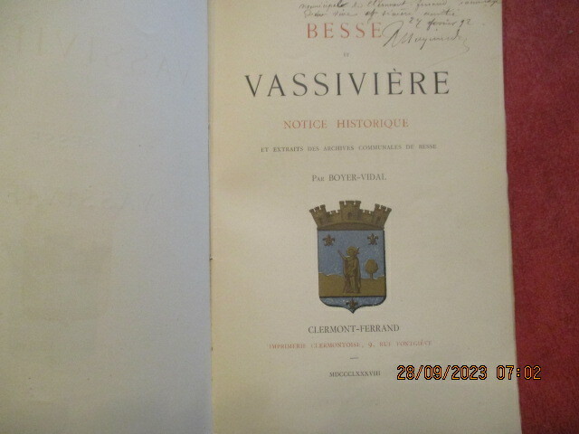 1888 Clermont-1888. Grand. in-8, broché, 50 pages plus un appendice de XX pages. Couverture illustrée d'un blason en chromolithographie représentant les armes de Besse et se reproduisant sur le titre et le faux titre. Notice peu courante augmentée dextraits des archives communales de Besse. Envoi de lauteur.