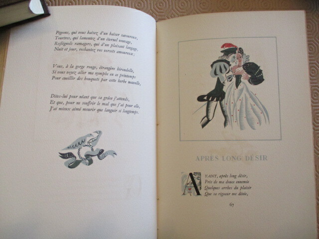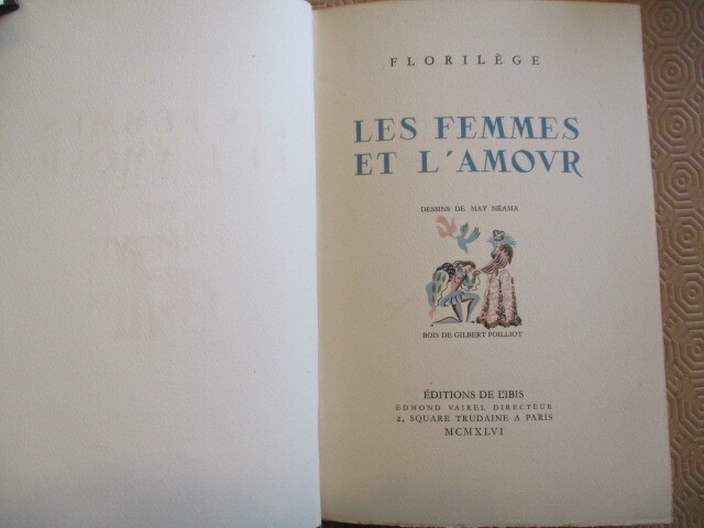 1946 Paris, Vairel, 1946. In-8, 113 pages plus la table des matières. Dessins de May Néama et bois en couleurs de Gilbert Poillot. Reliure époque demi chagrin fauve à coins, à nerfs, filets à froid, titre doré. Tirage limité à 1000 exemplaire sur papier de Lana (N° 343).