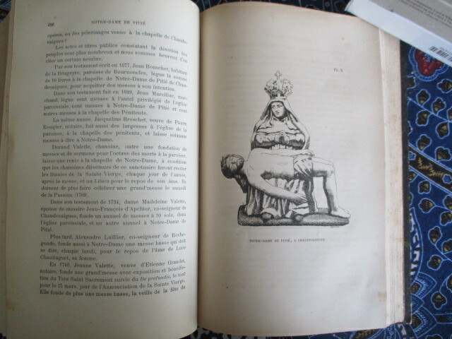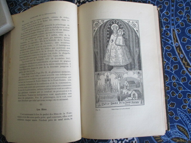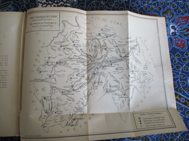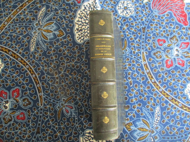 1888 Paris-Saint Paul, 1888. In-8, XXV-639 pages. Reliure époque demi basane, dos à nerfs, fleurons et tire dorés. 18 planches hors-texte dont une dépliante, 61 figures in texte et une carte hors-texte dépliante en fin de volume. Historique desdévotions à la vierge dans le Cantal (arrondissements de Mauriac, Aurillac, Murat, Saint-Flour), des origines au XIX° siècle (sanctuaires, pèlerinages, miracles, etc), présentation de plus de 30 statues de la Vierge, en appendice, notices sur 15 autres statues, érigées en plein air de 1865 à 1886.