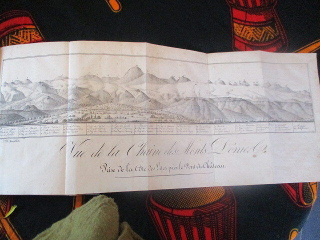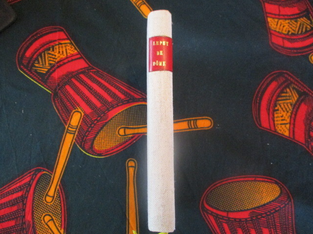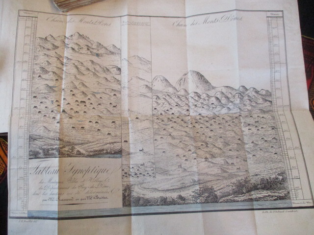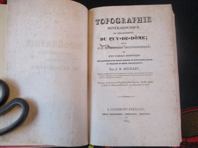 1829 Clermont-Ferrand, Berthier, 1829. In-8, XII-219 pages. Reliure récente pleine toile grège, dos lisse, pièce de titre maroquin rouge, titre doré, premier plat de couverture conservé. Edition originale suivie d'un dictionnaire oryctognostique et d'un tableau synoptique des hauteurs d'un grand nombre de montagnes, villes et villages du même département. Une planche hors-texte lithographiée dépliante en frontispice "vue de la chaîne des Monts dômes, prise de la côte des lites près de Pont-du-Château" et une planche hors-texte lithographiée dépliante en fin de volume "tableau synoptique des montagnes, villes et villages, du département du Puy-de-Dôme". Des rousseurs. Rare.
