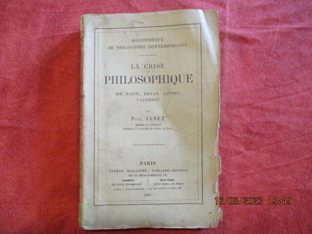 Germer Baillière, Paris. 1865. In-12. Broché. Etat d'usage, Couv. défraîchie, Dos fané, Fortes mouillures. 179 pages. Etiquette de code sur la couverture. Cahiers se détachant. Rousseurs.. . . . Classification Dewey : 100-PHILOSOPHIE ET DISCIPLINES CONNEXES