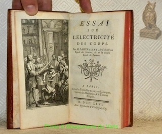 Recherches sur les Causes Particulières des Phénomènes Electriques et sur les effets nuisibles ou avantageux qu'on peut en attendre. Paris, les Frères Guérin en 1749. In-12 en veau d'époque. 444 pages avec la Table des Matières. 8 planches. Dos orné. Tranches rouges.Etat correct.(erreur de tomaison au dos.)