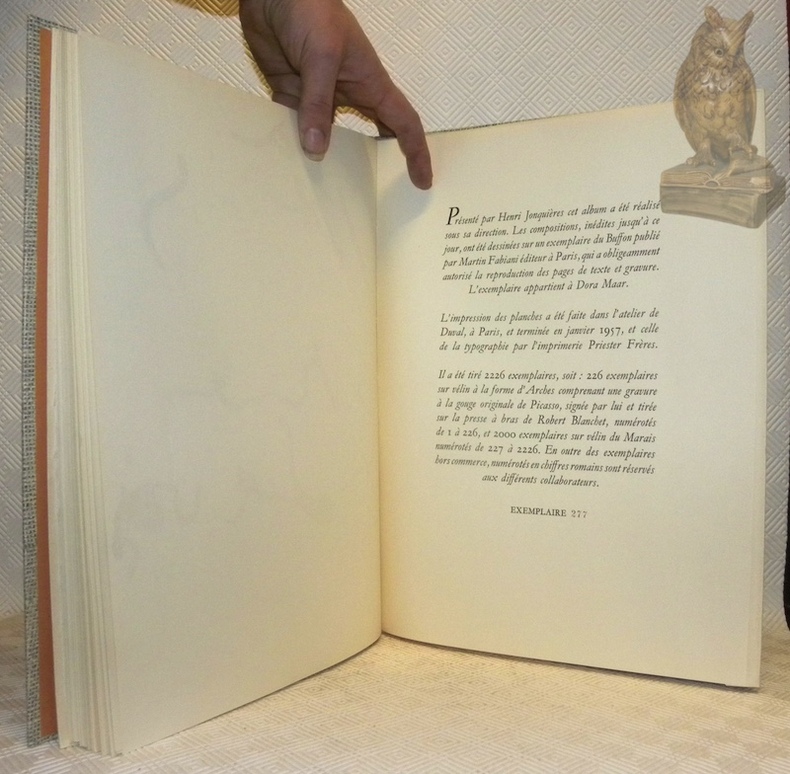 Paris Henri Jonquières 1957 in folio (37,5x28,5) 1 volume broché, couverture imprimée rempliée, rhodoïd, avec 40 dessins de Pablo Picasso.. Album réalisé sous la direction de Henri Jonquières. Les compositions inédites de Pablo Picasso, ont été dessinées sur un exemplaire du Buffon appartenant à Dora Maar. L'impression des planches a été réalisée par l'atelier Duval à Paris, et celle de la typographie par l'imprimerie Priester Frères Tirage limité à 2226 exemplaires numérotés, celui-ci un des 2000 exemplaires numérotés sur vélin du Marais. Très bel exemplaire ( Photographies sur demande / We can send pictures of this book on simple request )