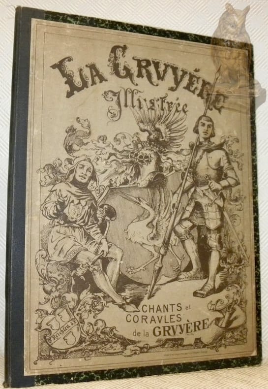 Fribourg, 1895-1896, 440x330mm, 86 + 13pages, illustrations de Joseph Reichlen, cartonnage, dos, percaline noir, couverture collée sur le plat supérieur. Bon état.
