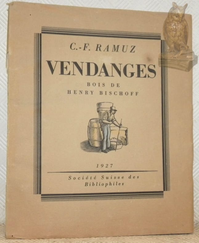 Lausanne, Société des Bibliophiles 1927, 280x225mm, 79pages, broché. Couverture rempliée. Exemplaire sur papier pur chiffon d’Auvergne, signé par l’auteur et par l’artiste, avec frontispice et une double suite des bois coloriés , numéroté n.° 83 / 200. A faire relier, déchirure au sur le haut du dos et la couverture inférieure, intérieure propre.