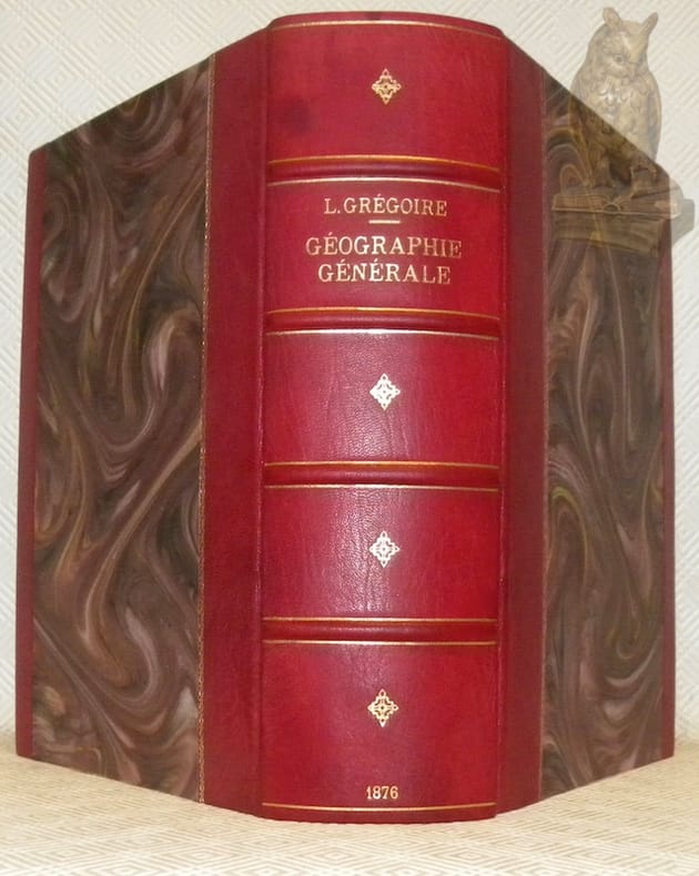 Un volume fort in-4° (21x29,3cm), demi-reliure chagrin vert foncé, avec dos à 5 nerfs portant sur l’un des caissons le titre et le nom de l’auteur en lettres dorées, plats marbrés de couleur dominante vert foncée, 3 tranches dorées, 1206 pages dont une table des matières (pp.1161-1172), d’une table alphabétique des noms (pays, villes, fleuves, rivières, montagnes etc. (pp1175-1206); on trouve in fine un Classement des cartes et gravures hors texte (au nombre de 46, dont 13 gravures en chromo). Les gravures en boir et blanc sont pour la plupart protégées par des serpentes. Ouvrage renommé, avec quelques rousseurs dispersées, certes, mais compact et sans aucun problème de reliure. Etat très satisfaisant.