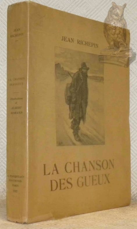 Premier tirage des 29 compositions d'Albert Morand: deux dessins de couverture, 17 compositions hors-texte et 10 d'en-tête. Édition limitée à 500 exemplaires numérotés. Celui-ci un des 420 sur Rives, n°241. Exceptionnel exemplaire enrichi de 100 dessins inédits d'Albert Morand (dont 10 hors-texte) exécutés au fusain, les in-texte étant parfois rehaussés au pastel. Tous ces dessins sont signés. Argotique en diable, répertoire des plus noires misères et d'étreintes sordides propres à faire passer L'Opéra de quat'sous (quant à lui inspiré par L'Opéra du gueux de John Gay) pour un sermon sur les vertus prononcé en l'église Notre-Dame de Passy, ce recueil poétique valut à Jean Richepin (1849-1926) de partager avec son génial prédécesseur François Villon le privilège peu enviable de goûter de la prison, en l'occurrence un mois à Sainte-Pélagie. Le livre, condamné, était déjà célèbre. Il fit date. En lisant un poème comme Les Mômes, ou encore le vibrant hommage qu'adresse Richepin à l'acteur Frédérick Lemaître, difficile de s'empêcher de penser que Jacques Prévert sut s'en souvenir au moment de rédiger le scénario des Enfants du paradis. Très bel exemplaire. Carteret, Livres illustrés modernes, V, 169.