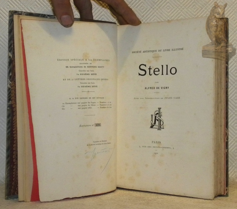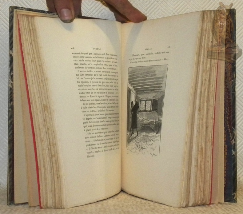 1901 Paris, Société Artistique du Livre Illustré, 1901 ; volume in-broché, couverture rempliée rouge imprimée en noir; (4), VIII,(4),334, (1)pp. Edition spéciale tirée à 500 exemplaires, illustrée de 65 compositions de Georges Scott gravées sur bois par Eugène Dété et de 41 lettres originales ornées gravées sur bois par Eugène Dété. 1 des 350 exemplaires sur papier vélin ( n°415).