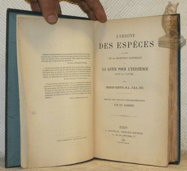 Paris Librairie C. Reinwald, Schleicher Frères, éditeurs sans date, vers 1950 0 in 8 (22,5x13,5) 1 fort volume reliure basane bigarrée havane de l'époque, dos à nerfs orné de filets et d'un fleuron doré, XXI et 604 pages. Charles Robert Darwin, Shrewsbury 1809 - Downe 1882, naturaliste anglais. La descendance ou l'origine de l'homme, la sélection sexuelle. Bon exemplaire ( Photographies sur demande / We can send pictures of this book on simple request )