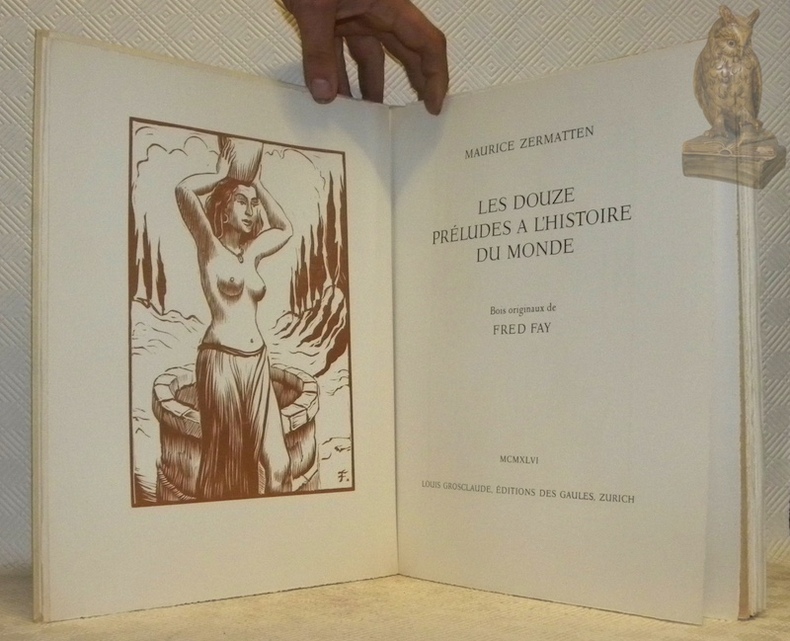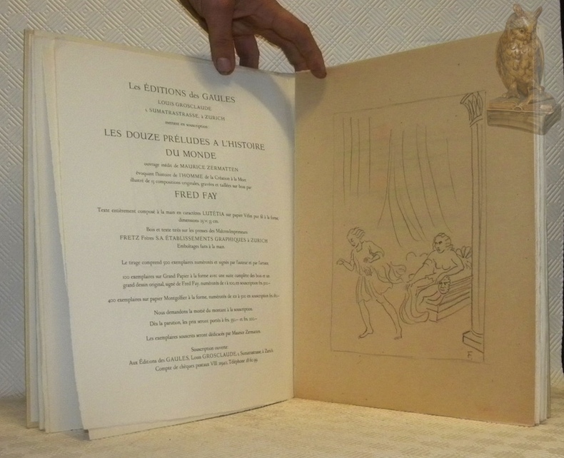 Zurich, Louis Grosclaude Editions des Gaules 1947, 350x265mm, 93pages, broché. Tirage à 520 exemplaires, 1 des 100 exemplaires numéroté sur papier du Marais à la forme, signé par l’auteur et l’artiste, n° 66 / 100. Avec un dessin original signé de Fred Fay et une suite complète des bois sur papier Chine. Bel exemplaire.