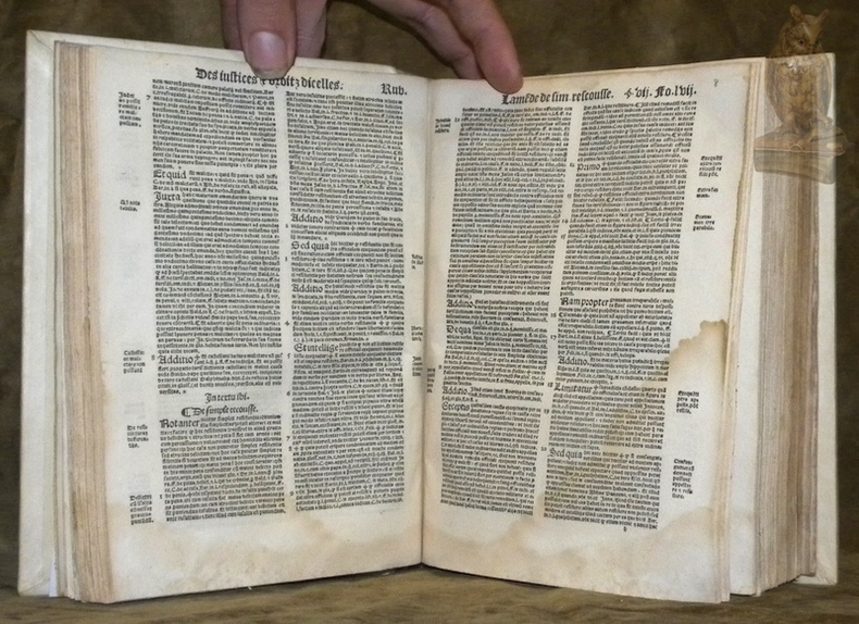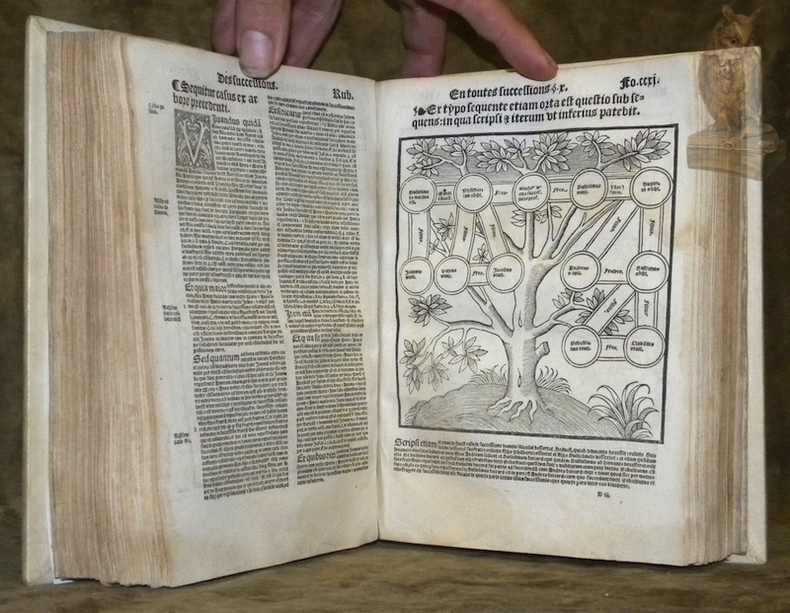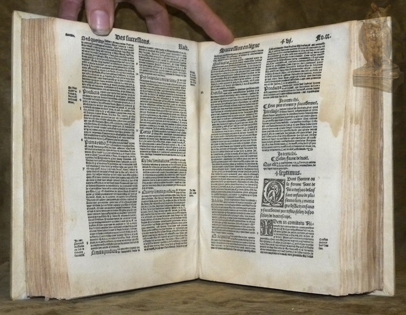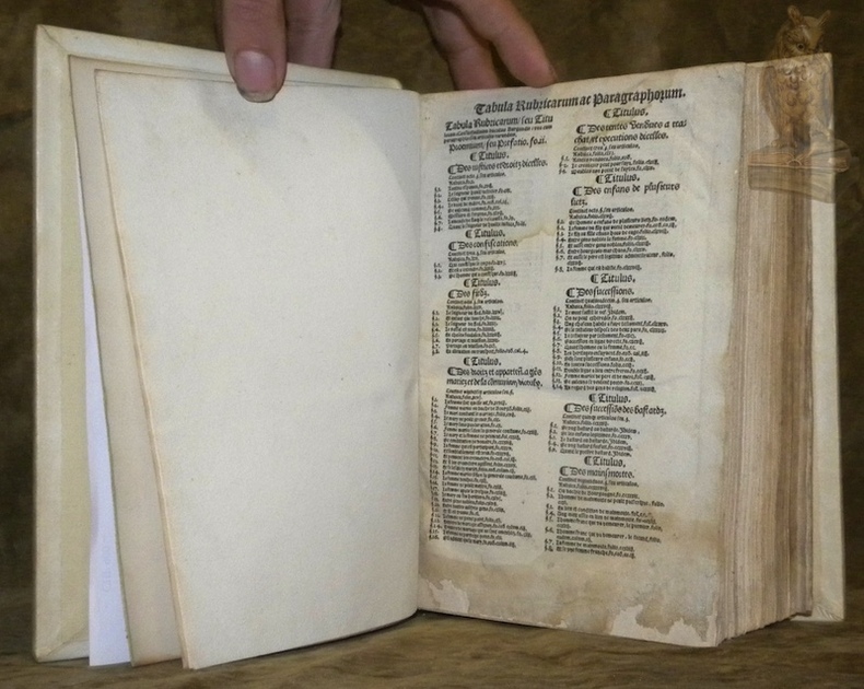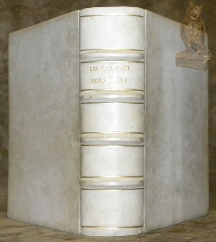 Parissis (Paris), sub signo Elephantis 1534, 215x160mm, reliure parchemin (XXème siècle) singée Handrick Fribourg avec titre, et filets dorés au dos à cinq nerfs. Ex-libris armorié de Bernard de Vevey. Bel exemplaire. Manque la page de titre.Cf. Brunet II, 357-58 (sous Coutumes - Bourgogne et Comté de Bourgogne).“L’apparition de son livre fut un évènement dans le monde judiciaire. Son succès dépassa bientôt les limites de la Bourgogne. On en multiplia les éditions, en France et à l’étranger, dans le courant du siècle et au commencement du siècle suivant. Le président Bouhier en avait compte près du vingt, et, du vivant de Chasseneuz on en fit plusieurs dans un format portatif, afin de servir de manuel ou de vade mecum aux gens de loi. On salua, en son auteur, l’homme qui, le premier, venait d’introduire la lumière du droit romain dans le chaos de coutumes locales. Plus tard, le président de Thou lui donna le nom de jurisconsulte d’une grande renommée, et Charles Loyseau, dans son Traite des Ordres, n’hésite pas a dire qu’il fut un des personnages les plus considérables de son temps" (J-Henri Pignot, Un jurisconsulte au seizieme siecle Barthelemy de Chasseneuz, premier commentateur de la coutume de Bourgogne..... Paris 1880, S. 141-42).