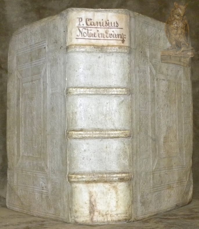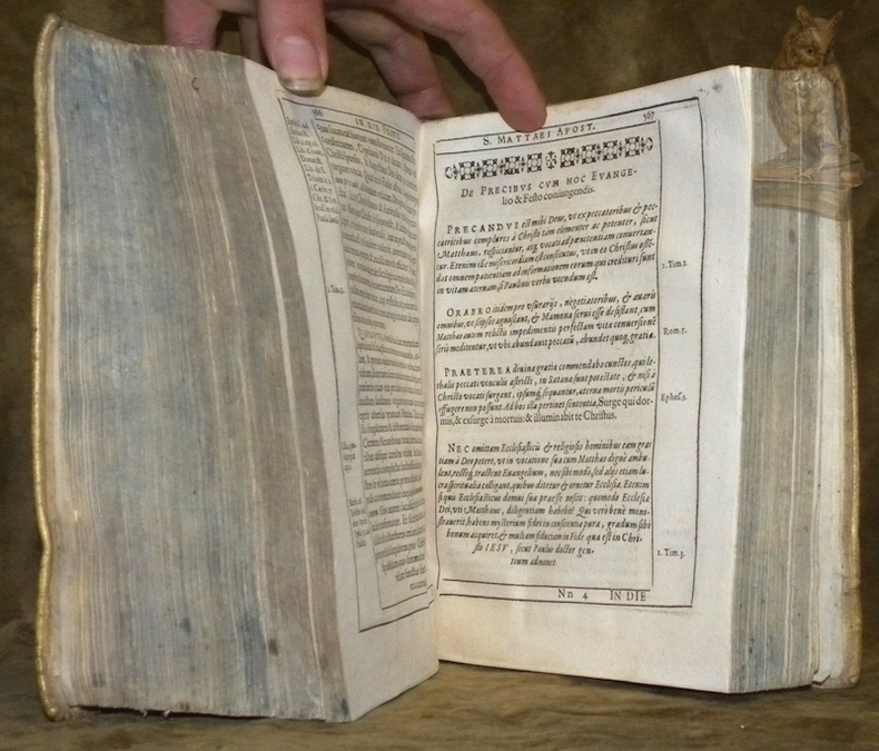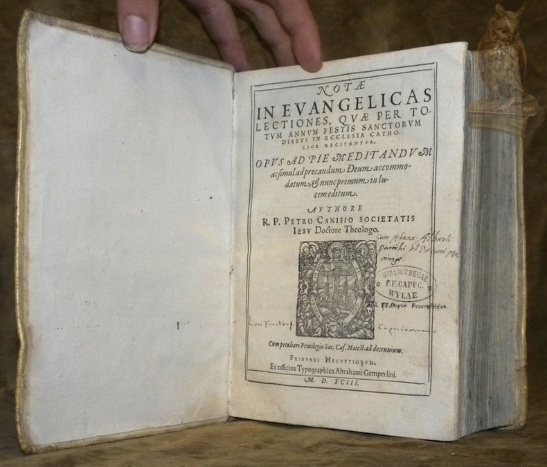 Friburgi Helvetiorum (Fribourg), Typographica Abrahami Gemperlini 1593, 210x165mm, reliure parchemin de l’époque avec etiquette d’auteur et titre manuscrit sur le haut du dos à quatre nerfs. Plat richement estampé d’encadrements et ornementations à froid. Bel exemplaire. Cachet de bibliothèque sur la page de titre.