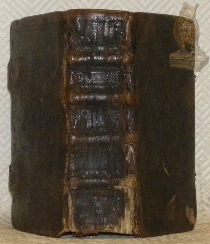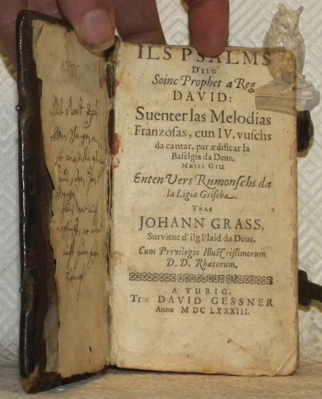Turig (Zürich), David Gessner 1683, 140x80mm, reliure veau marbré de l’époque. Dos à quatre nerfs. Coiffe inférieure abimée, charnières craquelées, trous sur le bas du coin de plat supérieur. Avec deux fermoirs. Inscription manuscrite sur la feuille de garde supérieure. Dernière feuille déchiré, sans manque de texte.