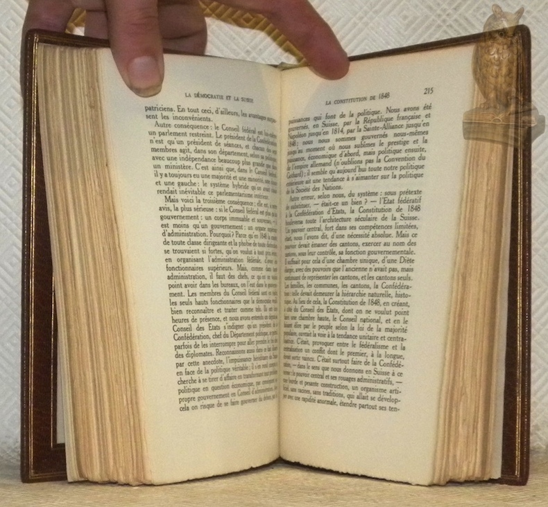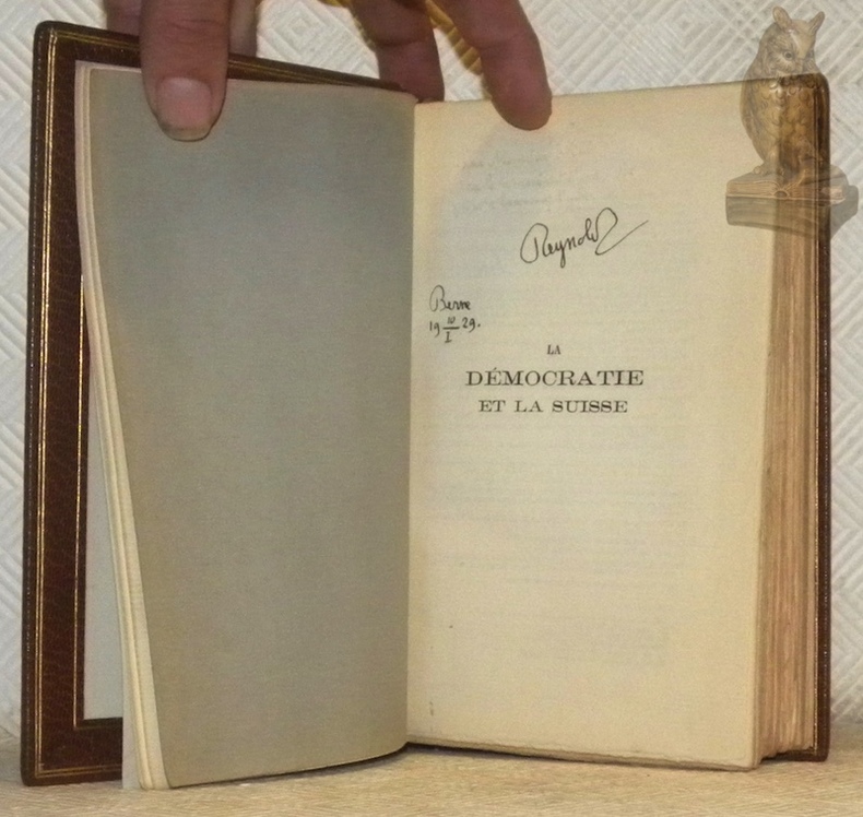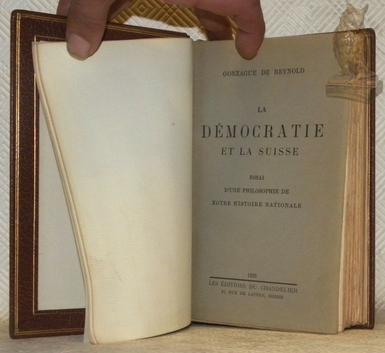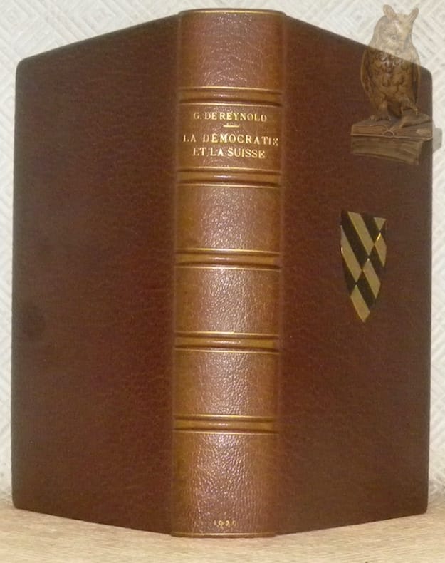 Berne, Les Editions du Chandelier 1929, 200x125mm, XVII - 370pages, reliure plein maroquin avec auteur, titre et filets dorés au dos à cinq faux-nerfs (quatre nerfs), ecu héraldique mosaïqué au milieu du plat supérieur, dentelle intérieure en maroquin et avec triple encadrements dorés, avec signé, garde papier soie, couvertures et dos conservés. Très belle reliure signée Asper Genève. Très bel exemplaire avec signature de Reynold sur la page de faux-titre et sur papier Hollande Van Gelder, numéroté n.° 14 / 20.
