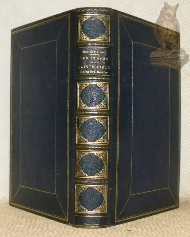 Paris, Etienne Challiot sans date, vers 1851 - 1857, 275x190mm, reliure plein chagrin azur avec auteur, titre et caissons ornés dorés au dos à cinq faux-nerfs (quatre nerfs). Encadrements dorés sur les deux plats. Toutes tranches dorées. Boirdure fleurie. Dentelle intérieure (fleurs de Lys). Garde papier velour blanc. Belle reliure signée Pelerin Troyes. Bel exemplaire. Liste des Harmonies :1er Harmonie: Eve présentant a Dieu son premier enfant, scène pour voix de mezzo soprano. 2e Harmonie: Agar dans le désert de Bersabée, scène pour voix de sporano. 3e Harmonie: Rebecca a la fontaine, scène pour voix de mezzo soprano. 4e Harmonie: Rachel, pastorale avec accompagnement de Hautbois pour voix de tenor. 5e Harmonie: La fille du pharaon berçant Moise, scène pour voix de soprano. 6e Harmonie: Débora, cantique de Débora, scène pour voix de contralto. 7e Harmonie: La fille de Jephté, solo et choeur de jeunes filles, scène pour voix de soprano. 8e Harmonie: Ruth et Noémi, duo pour voix de soprano et contralto. Deuxn aajouts: David, scènes lyriques et Suzanne, cantate a quatre voix avec choeur. 9e Harmonie: Les deux Mères devant Salomon, trio pour voix de soprano, contralto et basse. 10e Harmonie: La Reine Saba, cantabile pour voix de mezzo soprano. 11e Harmonie: Anne, Mère de Samule, cantabile pour mezzo soprano. 12e Harmonie: La Pythonisse d’Endor, scène pour contralto. 13e Harmonie: La veuve de Sarepta, mélodie pour messo soprano. 14e Harmonie: Athalie, scène pour contralto. 15e Harmonie: Sara, femme de Tobie, pastorale pour ténor. 16e Harmonie: Judith, scène pour contralto. 17e Harmonie: Vasthi, femme d’Assuérus, air pour mezzo soprano. 18e Harmonie: Esther, scène pour soprano. 19e Harmonie: La mère des Machabées, scène avec choeur poour ontralto. 20e Harmonie: Marie chez Elisabeth, duo pour soprano et contralto.