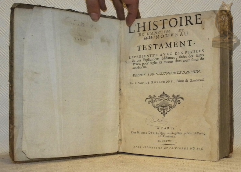 Paris, chez Michel David 1712, 270x205mm, 550pages, reliure demi-veau marbré avec pièce de titre doré au dos à cinq nerfs. Plat cartonnage moucheté. Reste d’ancienne étiquette sur le bas du dos. Coiffes,coins et bordures usés. Nom du possesseur sur le haut de la page de garde supérieure et le bas de lustre gravé sur la page de titre. Quelques pages restaurées. Rares faible rousseurs et mouilleures claires sur le bords des feuillets des pages 505 à 536. Bords latérales des pages, 2, 4, 5, 6, 7, 8, 12, 14, 15, 16, 370, 371, 404, 405, 406 et 522 restaurés, bords des bas des pages 296 et 470 restaurés, bords des haut des pages 403 et 405 restaurés. Partie du texte imprimé d’origine restauré par écriture manuscrite aux pages 9, 10, 11 et 13.