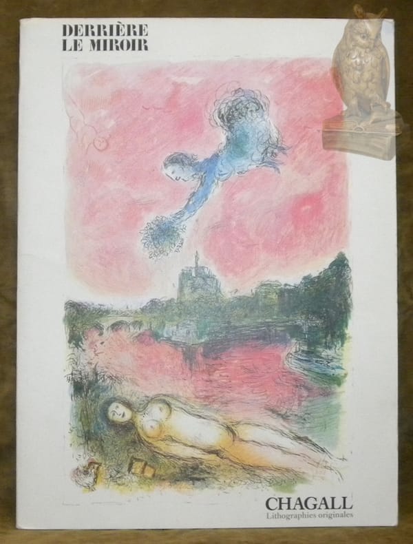 Paris, Maeght éditeur, 1972. In-folio (380 x 280 mm) en feuilles, 30 pages sous couverture illustrée, chemise et étui éditeur rose avec étiquette titrée sur le front. - 3 LITHOGRAPHIES ORIGINALES EN COULEURS DE MARC CHAGALL : la couverture, "Pantomime", une pleine page , "Jour de Printemps" et une double-page "Après l'Hiver" (38 x 55,8 cm). Texte de Louis Aragon "Chagall l'admirable" en édition originale. - 1 DES 150 EXEMPLAIRES DE TÊTE SUR VÉLIN DE RIVES. Complet et à l'état de neuf. TIRAGE ORIGINAL. Références: Sorlier-Mourlot Chagall: Les lithographies n° 649-650-651 - P. Cramer: Chagall Les livres illustrés n° 91. Photographies supplémentaires sur demande. —— ENGLISH DESCRIPTION: DERRIERE LE MIROIR (Behind The Mirror) No. 198 - DE LUXE COPY ON VELIN DE RIVES (WOVE PAPER). Paris, Maeght, 1972. In-folio (380 x 280 mm) in loose sheets, 30 pages under illustrated cover, publisher's folder and slipcase with titled label on the front. - 3 ORIGINAL COLOR LITHOGRAPHS BY MARC CHAGALL: the cover, "Pantomime", a full page, "Spring Day" and a double-page "After Winter" (38 x 55.8 cm). Text by Louis Aragon "Chagall l'admirable" published here for the first time. - 1 OF 150 HEAD DELUXE COPY PRINTED ON VÉLIN DE RIVES. Complete and in perfect condition, as new. ORIGINAL PRINT. References: Sorlier-Mourlot Chagall: Lithographs n° 649-650-651 - P. Cramer: Chagall Illustrated books n° 91. More pictures on request.