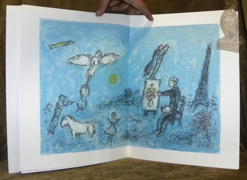 Paris, Maeght éditeur, 1981. In-folio (380 x 280 mm) en feuilles, 28 pages. DLM édité en mai 1981 pour l'exposition des nouvelles lithographies originales de CHAGALL à la Galerie Maeght. 28 pages non reliées. 1 LITHOGRAPHIE ORIGINALE EN COULEUR EN DOUBLE PAGE, celle-ci mettant en scène la plupart des personnages de l'univers poétique et pictural de Chagall. 12 reproductions en couleur à pleine page et 1 en noir. Tirage original d'une très grande qualité d'impression.