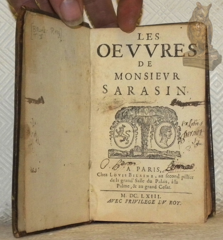 Paris, Louis Bilaine 1663, 150x90mm, reliure veau ancien de l’époque, dos à cinq nerfs. Dorures au dos passées, charnière supérieure craquelée, coiffe supérieure abimée, coins cornés, étiquette de bibliothèque sur revers du plat supérieur, nom du possesseur sur la page de titre et déchirure sur la dernière feuille, sans atteinte de texte. Brunet T.V, page 139.