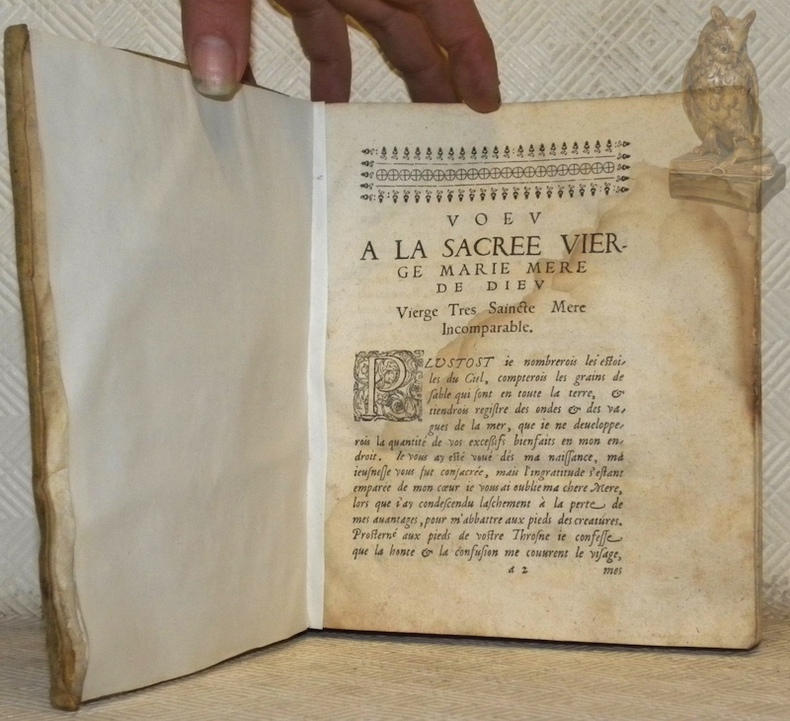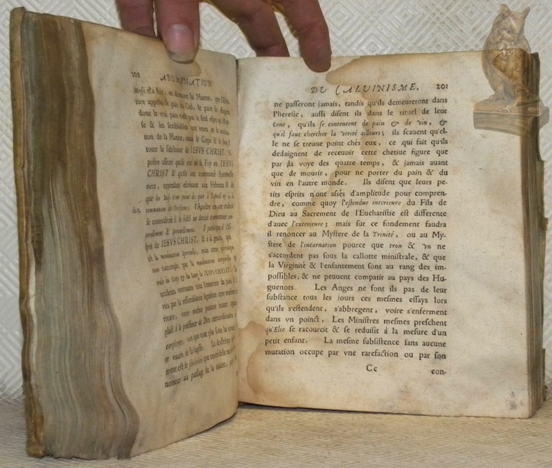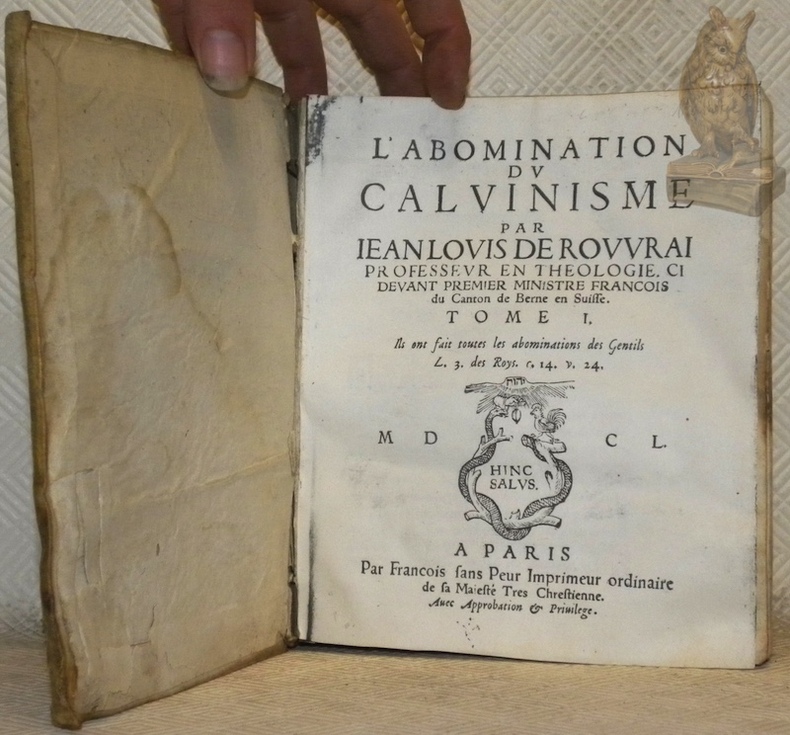 Paris (Fribourg), Par François sans Peur imprimeur ordinaire de sa Majesté tres chrestienne (Guillaume Darbellay 1650, 200x165mm, reliure parchemin de l’époque, auréoles sur le milieu des pages, autrement bon état.L’auteur d’origine lorraine, avait été religieux minime avant de passer à la Réforme et de se réfugier en Suisse, à Yverdon, 1642, ou il exerça la médecine, avant de passer à Berne, 1645, ou il devint le premier prédicateur calviniste de langue française et remplit les fonctions de pasteur, en 1648, il quitte Berne pour Fribourg et abjure, il meurt en 1651, seul le tome 1 fut publié, les frais d’impression ne furent jamais payés à l’imprimeur Darbellay! Bosson - L’atelier typographique de Fribourg, 178. DHBS (ancienne édition, uniquement !) t. 5 p. 579.