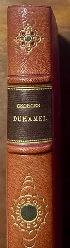 Paris, Mercure de France 1930, 265x180mm, 248pages, reliure demi-maroquin à coins pièces d’auteur et de titre, et filets, fleurons et ornementations dorés au dos à quatre nerfs, mosaïque au dos, tranche supérieure dorée et rognée, autre tranches non rognées, plat papier marbré argenté, garde papier marbré doré, couvertures et dos conservées. Belle reliure signée VD. JIRASHO. Très bel exemplaire sur papier Hollande van Gelder, numéroté n.° 105 / 286, deuxième tirage après 66 exemplaires sur papier Japon impérial et avant 33 exemplaires sur papier Ingres crème et avant 1625 exemplaires (en format in-16) sur papier vergé de fil Montgolfier