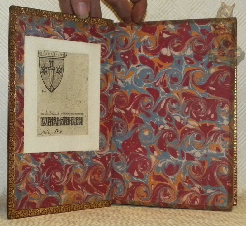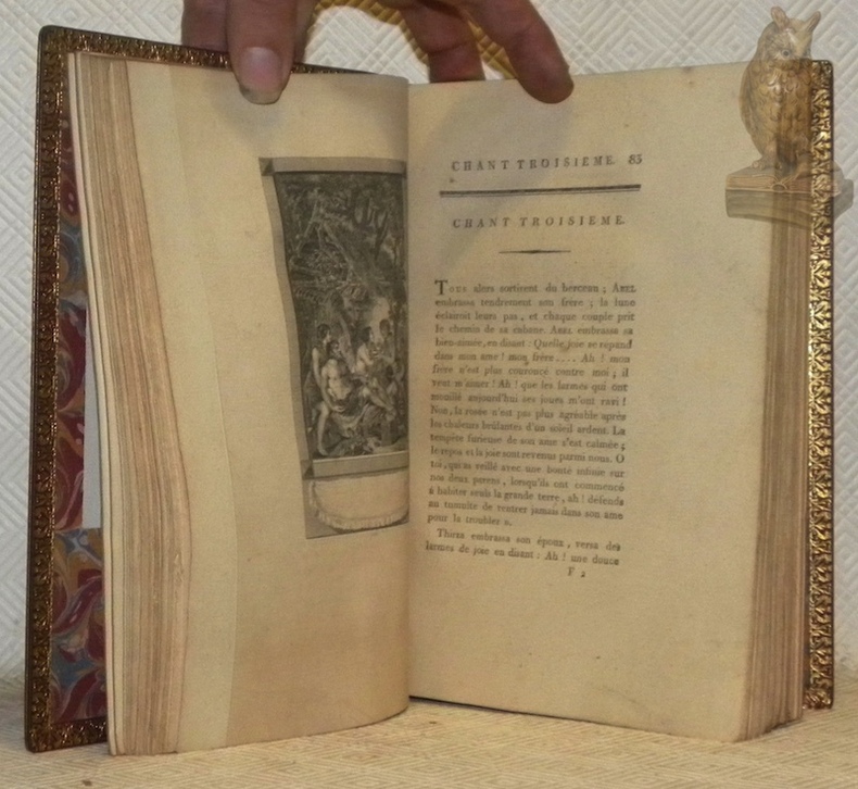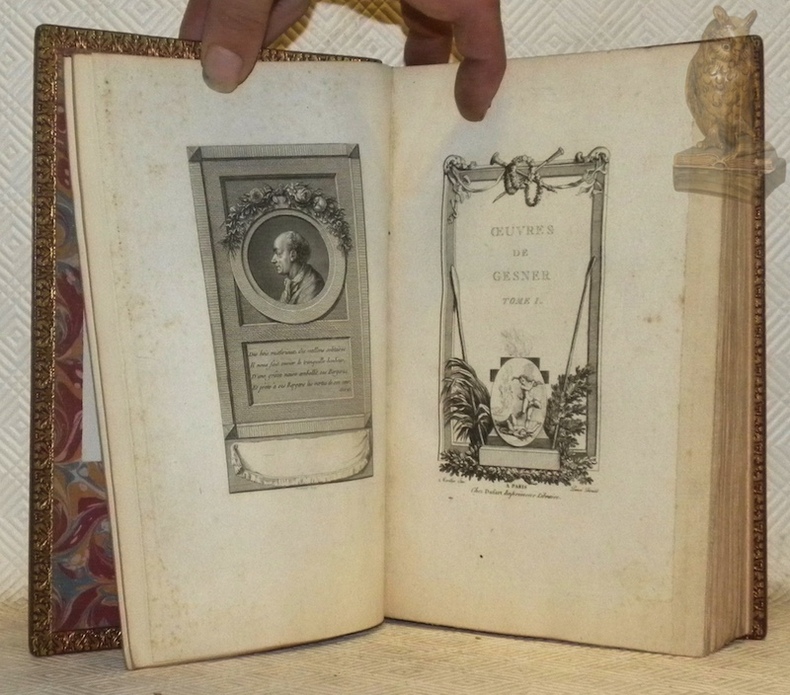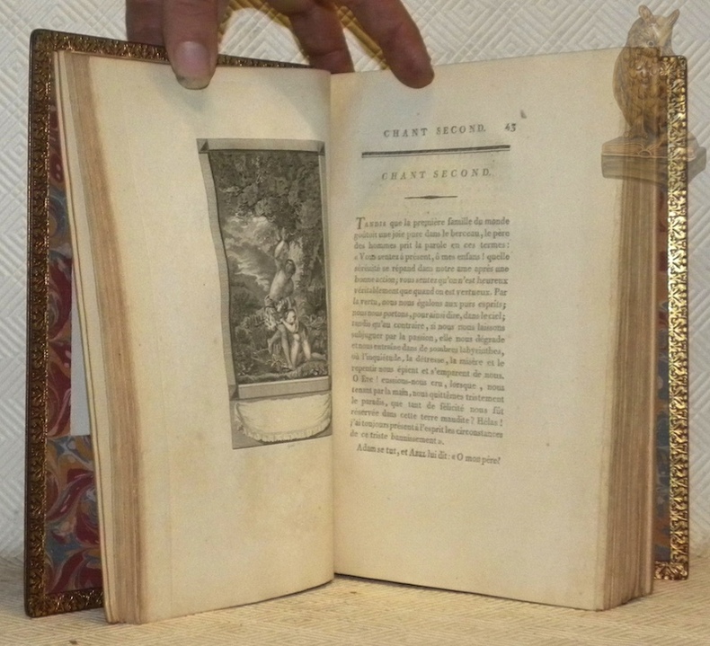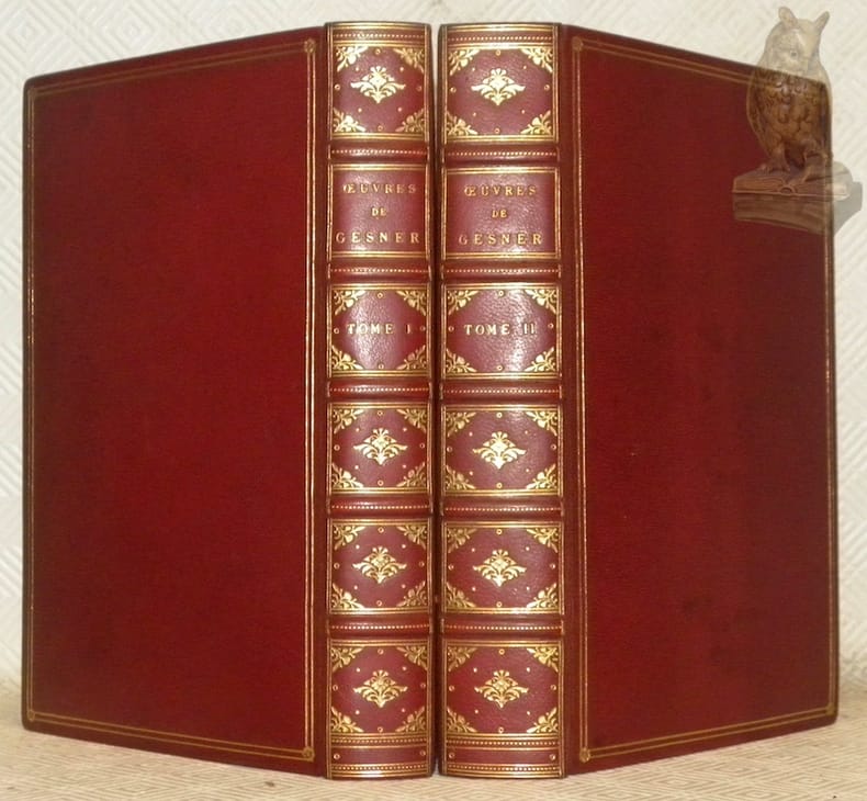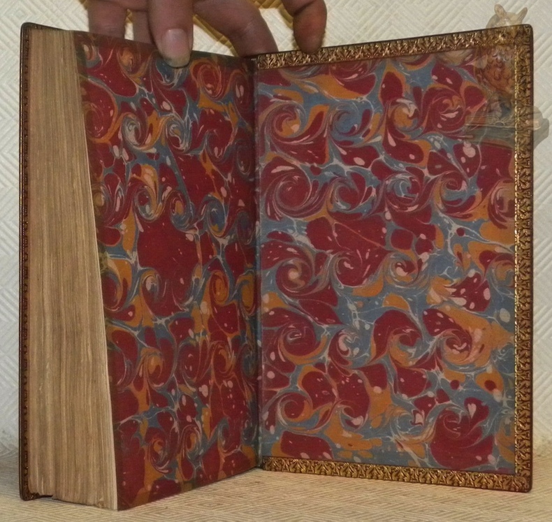 Paris, Dufart sans date, vers 1800, 230x150mm, XVI - 367 + 447pages, reliure plein maroquin rouge avec titre, tomaison, filets, ornementations et encadrements ornés de fleurons dorés au dos à cinq faux-nerfs (quatre nerfs), plat double encadrements et fleurons sur le coins dorés, filets dorés sur les bordures et le coiffes, dentelles avec ornementations dorées, tranche supérieure dorée et rognée, autre tranches non rognées, garde papier marbré. Ex-libris : die Werdi - 1551, Rüegg, aus des Bücherer Wehrli-Thielen, n.° 54a et 54b. Très belle reliure signée Durvand-Pinard Sc. (scussesseur). Cohen p. 434. Très bel exemplaire.