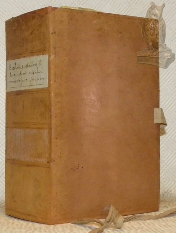 1846 - 1867, 235x150mm, 47 brochures (quelques une allemand), sous cartable veau blond à lacets, sur la création et la construction du réseau de chemin de fer Centre-Ouest-Suisse (Fribourg, Bulle, Romont, Lausanne, Lac de Bret, Genève-Versoix, Yerdon, Laupen, Morat, Berne)