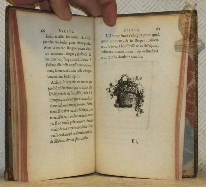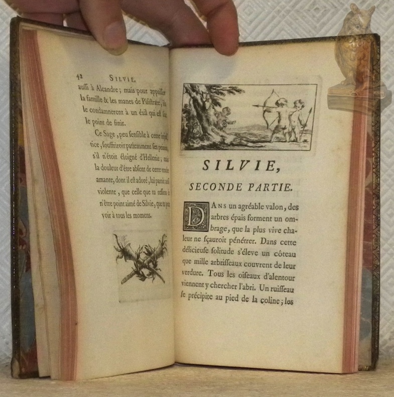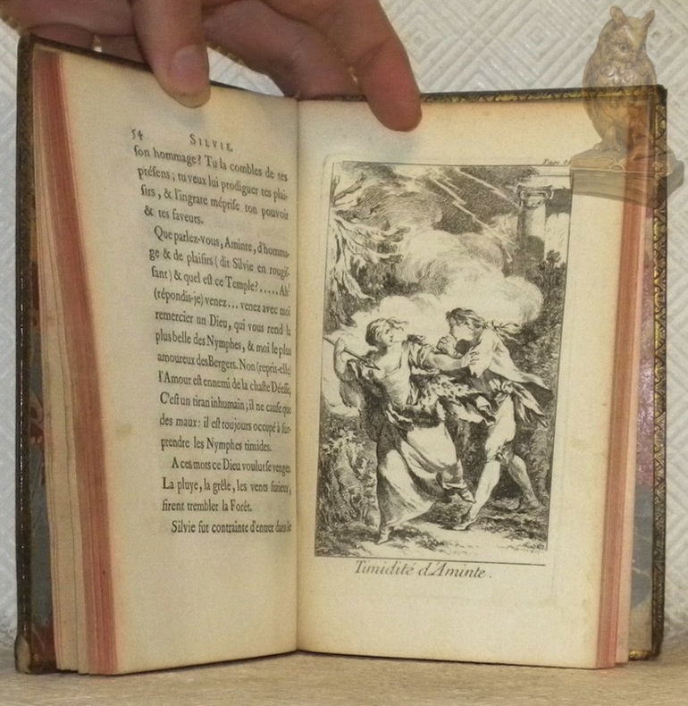 12 x 18,5 Londres 1743 Volume in-8, reliure plein veau marbré de l'époque, dos à cinq nerfs orné de motifs floraux, triple filet doré sur les plats, tranches rouges, comprenant reliés à la suite: 1. "Silvie", Londres, [Paris-Prault], 1743, frontispice, vignette de titre, 78 p., 8 gravures hors texte, 4 bandeaux et une vignette gravés. 2. "Le temple de Gnide", revu, corrigé et augmenté, Londres [Paris, Huart, 1742], frontispice, vignette de titre, [2]-viii-85 p., 8 vignettes gravées, suivi d'une courte pièce en prose "Céphise et l'amour" du même auteur. Réunion de deux pastorales, mythologiques et galantes, qui a l'avantage de réunir dans deux éditions illustrées, en partie originales, Watelet (1718-1786) et Montesquieu (1689-1755) sur le thème de l'amour, que Montesquieu, dans la préface évoque en ces termes "A l'égard du beau sexe, à qui je dois le peu de moments heureux, que je puis compter dans ma vie, je souhaite de tout mon coeur que cet ouvrage puisse lui plaire. Je l'adore encore, & et s'il n'est plus l'objet de mes occupations, il l'est de mes regrets". Les illustrations de "Silvie" ont été dessinées par Pierre, gravées à l'eau-forte par Watelet lui-même, et terminées par Cochin. La figure de la Timidité d'Aminte a été entièrement gravée par Cochin. L'illustration du "Temple de Gnide", dont la première publication fit scandale en 1725, est attribuée à Jacques de Sève. Reliure usagée (coiffes, coins, coupes, mors fendus), petites échancrures aux quatre première pages, quelques rousseurs aux marges et sur les gardes, illustrations en bon état.(EvC146) PHOTOS NUMERIQUES DISPONIBLES PAR EMAIL SUR SIMPLE DEMANDE-DIGITAL PHOTOGRAPS MAY BE AVAILABLE ON REQUEST Livre