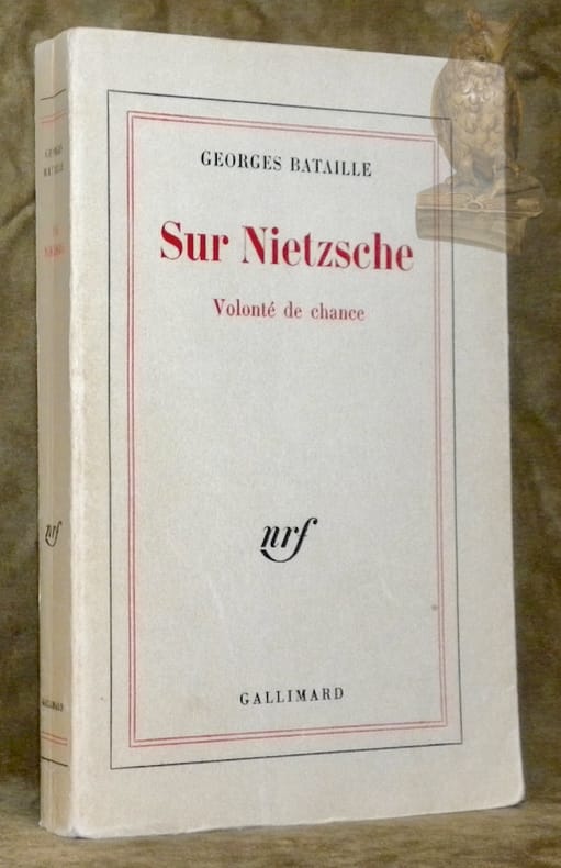 Édition originale. Exemplaire du service de presse sur papier d’édition. Précieux volume offert par l’auteur à Sylvia Bataille et à Jacques Lacan. Il porte cet envoi de Georges Bataille à l’encre bleue sur le faux-titre : à Sylvia et à Jacques affectueusement Georges Après avoir épousé l’auteur d’Histoire de l’œil en 1928, Sylvia Bataille partagea la vie de Jacques Lacan de 1938 jusqu’à la mort de ce dernier en 1981. Bataille gardera de bonnes relations avec son ex-épouse, et fut très proche de Lacan dans les années 1940. Sur le cercle intellectuel de Georges Bataille à cette époque, fréquenté entre autres par Jacques Lacan, Michel Leiris, Jean-Paul Sartre et Simone de Beauvoir, voir Élisabeth Roudinesco. Sur Nietzsche est un des livres fondamentaux de Bataille, peut-être même la clef de tous les autres. «Si toute la pensée athéologique repose en effet tout entière sur la notion de système, elle en est en même temps l’excès. Des textes comme Madame Edwarda, Le Mort, Le Petit représentent sans conteste cet excès. Le Coupable, L’Expérience intérieure, d’une certaine façon aussi. Bataille ne les a-t-il pas sciemment expurgés de ce qui justifiait cet excès à en ruiner le système ? Mais le système existe, et Sur Nietzsche, le dernier des grands livres de cette somme, le met à nu... » (Michel Surya) «À peu d’exceptions près, ma compagnie sur terre est celle de Nietzsche...», a écrit Bataille, et aussi : « Je suis le seul à me donner, non comme un glossateur de Nietzsche, mais comme étant le même que lui.» Benoît Goetz s’est interrogé sur cette «mêmeté» de Nietzsche et de Bataille, «qui n’est pas identité, dont l’origine n’est pas d’ordre mimétique... Ou si identité il y a, elle est peut-être du même ordre que celle dont parlait Deleuze : “la grande identité” de Spinoza et de Nietzsche ». Cette « mêmeté », poursuit-il, « n’est pas sans rapport avec ce que Nietzsche a nommé “éternel retour du même”, et qui n’a rien à voir, comme Deleuze l’a bien souligné, avec la très vieille hypothèse de cycles cosmiques répétitifs. À travers la répétition tout change et varie. Bataille n’est donc pas un clone de Nietzsche, qui ne réclamait ni disciples ni épigones, mais un écho. Bataille fait écho à Nietzsche. On peut nommer ce phénomène “parodie”, même si le mot n’est plus à la mode. Cela signifie qu’une pensée et une écriture, un mode de vie, un ethos glissent le long d’autres textes et d’autres pensées, au point de les épouser, comme un anneau un autre anneau, mais sans confusion aucune. Noces contre nature, celles de la guêpe et de l’orchidée. Mélodie éternelle qui se chante elle-même.» Le saut nietzschéen dont il faut faire l’expérience, consisterait, pour Bataille, «à mordre la tête du serpent de l’esprit de vengeance (pour reprendre l’image du Zarathoustra), et à se débarrasser du ressentiment contre le temps et le “il était”. C’est le fond sans fond de la pensée du retour. [...] Comme Nietzsche, Bataille est un penseur du plus grand sérieux qui se renverse en jeu et en danse. » La pensée de Nietzsche, saisie à travers le prisme de l’œuvre de Bataille, « est por- teuse d’une affirmation qui n’est affirmation que de l’affirmation, et non d’une doctrine particulière. La “doctrine” de l’éternel retour est sans contenu, à la différence, sans doute, de la doctrine de la volonté de puissance. Pour parler comme Heidegger, cette dernière énonce quelque chose concernant l’être de l’étant. La “doctrine” de l’éternel retour, la “grande pensée” n’énonce rien de tel. Elle est l’affirmation d’une manière d’être, d’une manière de l’être lui-même, qui ne comporte rien de fixe, donc rien d’étant et qui par conséquent nous emporte nous-même...» Comme l’écrit Nietzsche dans Le Gai savoir, « L’impérieux jeu du monde / mêle l’être et l’apparence / L’éternelle extravagance / Nous y mêle pêle-mêle. » (trad. de Pierre Klossowski). Marges un peu jaunies, infimes traces d’usure à la couverture. Provenance : Sylvia Maklès (1908-1993) et Jacques Lacan (1901-1981), puis par descendance. – Sotheby’s, cat. Livres et manuscrits, 15 décembre 2020, lot 86. Références : Élisabeth Roudinesco, Jacques Lacan, Paris, Fayard,1993, pp.172-229, passim.– Michel Surya, Georges Bataille, la mort à l’œuvre, Paris, Gallimard, 1992 (rééd. 2012), p. 390, passim. – Benoît Goetz, « Éternel retour de Nietzsche », in Le Portique, revue de philosophie et de sciences humaines, no 29, 2012 (en ligne).