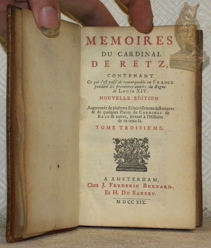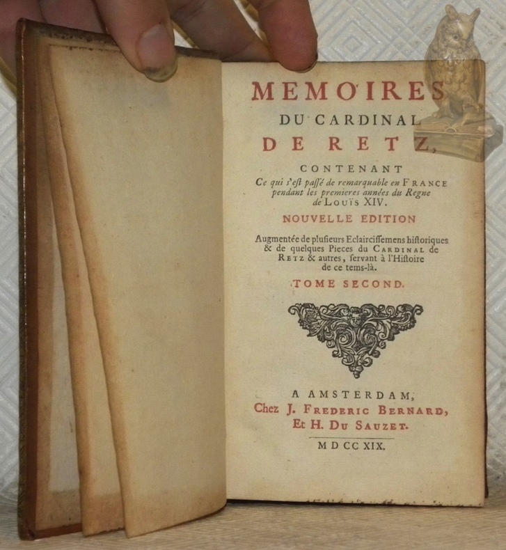 Amsterdam, Chez Jean Frederic Bernard et H. de Sauze 1719, 160x100mm, reliure plein veau-marbré de l’époque avec titre, tomaison et caissons ornés dorés au dos à cinq nerfs, bordures dorées, tranches marbrées. Ex-libris : Manfred Gsteiger. Charnières et plats frottés. Intérieur propre. Bel exemplaire.