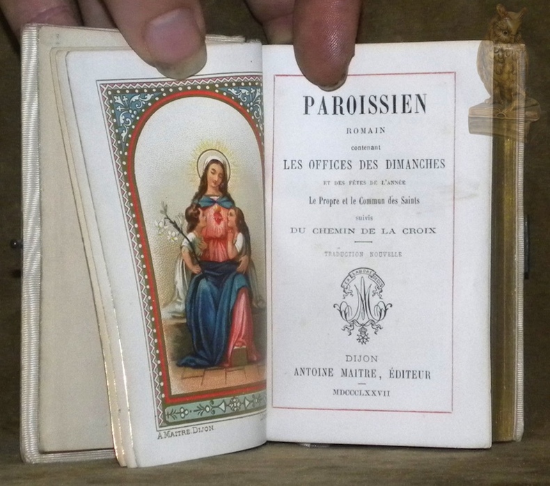 Dijon, Antoine Maitre 1877, 110x70mm, reliure ivoirine, monogramme VE sur le milieu du premier plat, toutes tranches dorées, garde papier velour. Manque le fermoir, autrement bel exemlplaire.