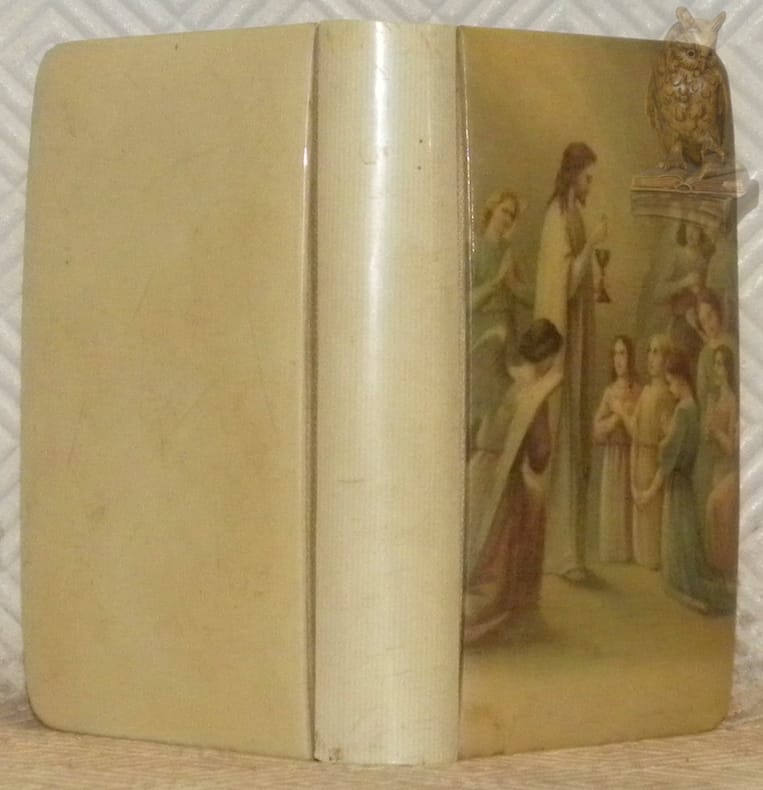 Turnhout, Etablissements Brepols, Librairie Universelle Catholique 1936, 105x70mm, frontispice, 318pages, reliure ivoirine avec plat supérieur illustré en couleur, toutes tranches dorées, garde toile velour. Hormis inscription manuscrite sur la page de garde supérieure, bel exemplaire.