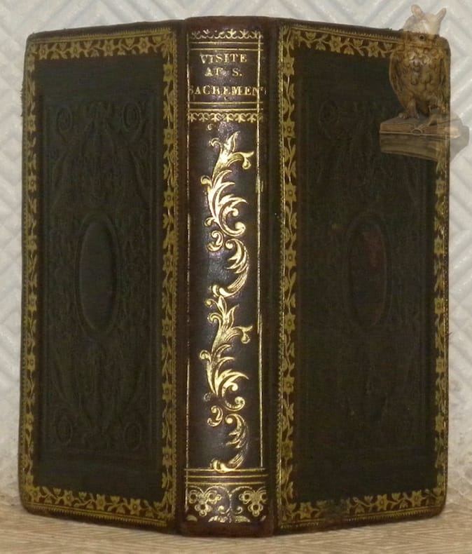 Dole, Prudont 1833, 105x65mm, reliure plein basane noir avec titre et ornementations dorés au dos, bordures, encadrement orné doré sur les deux plats avec au milieu ornementations à froids, garde papier marbré. Nom du possesseur sur le haut de la page de garde supérieure et rousseurs marginales.