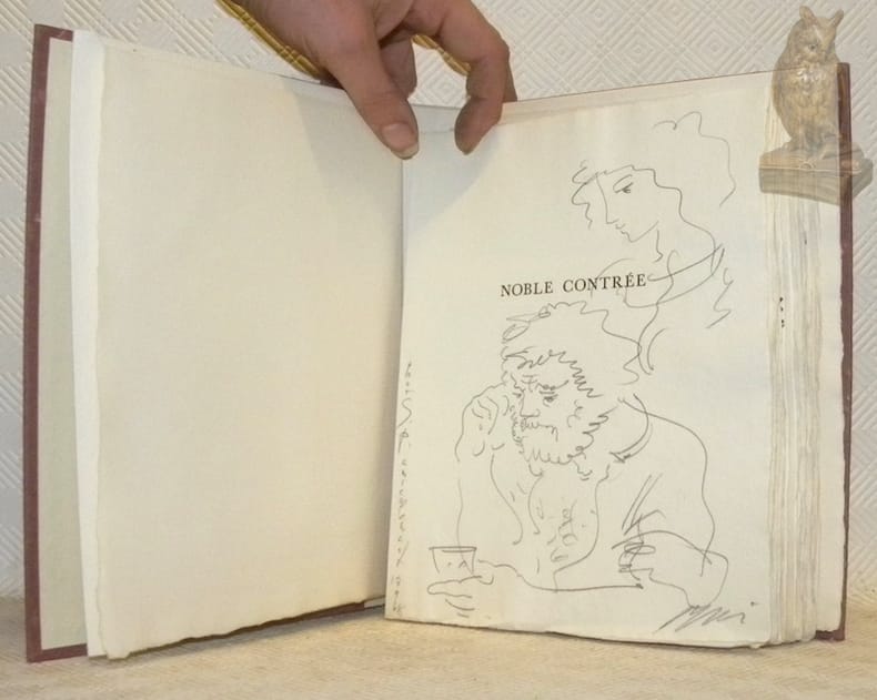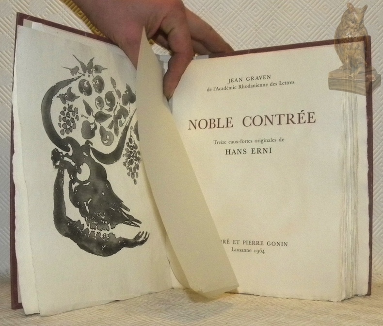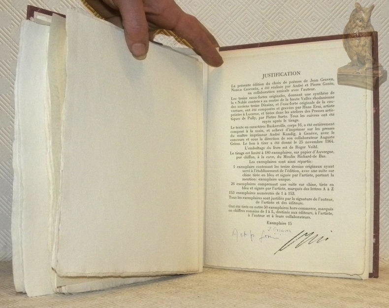 Lausanne, André et Pierre Gonin 1965, 260x200mm, 119pages, en feuille, couverture rempliée, chemise rigide et étui. Un des 180 exemplaires sur papier d’Auvergne, pur chiffon, à la cuve, du Moulin Richard-de Bas, numéroté n.° 15 / 153. Les treize eaux-fortes originales, donnant une synthèse de la “Noble contrée” au centre de la haute Vallée rhodanienne des anciens treize Dizains, et l’eau-forte originale de la couverture, on été composées et gravées pas Hans Erni, artiste peintre à Lucerne, et tirées dans les ateliers des Presses artitiques de Pully, par Pietro Sarto. Tous les cuivres ont été rayés après le tirage. Le texte en caractères Baskerville, corps 16, a été entièrement composé à la main, et achevé d’imprimer sur les presses du maître imprimeur Andér Kundig, à Genève, avec le concours et sous la direction de son collaborateur Auguste Griess. Signés au colophon par l’auteur, l’artiste et les éditeurs. Le bon à tirer a été donné le 25 novembre 1964. Très bel exemplaire.