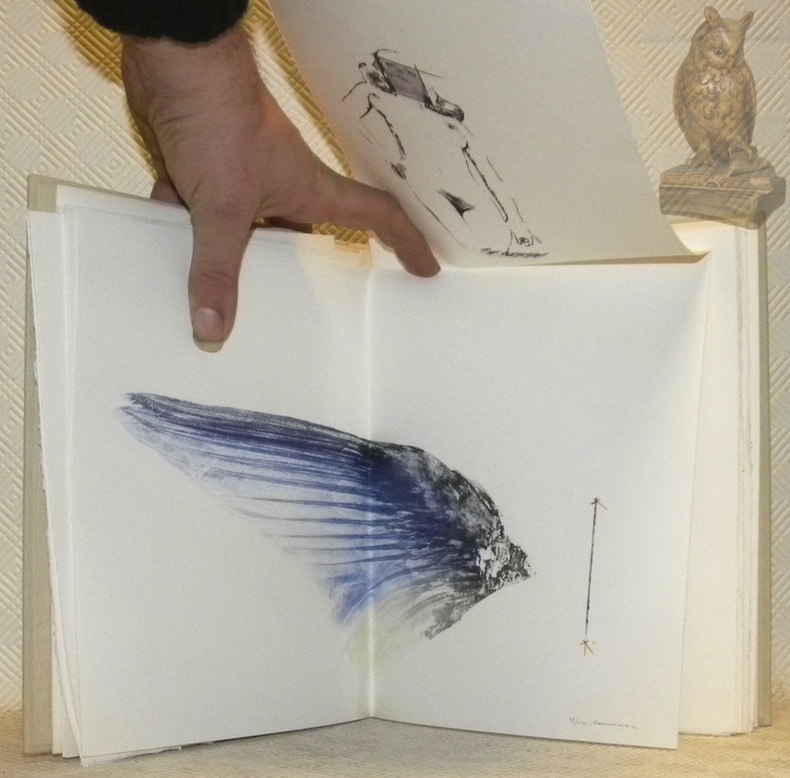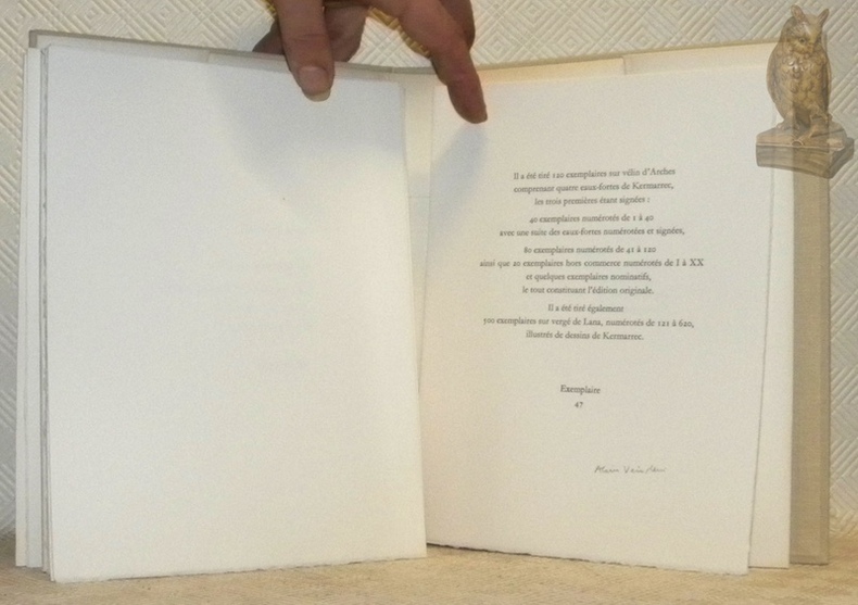 Paris, Maeght Editeur 1977, 260x195mm, en feuille, (22 feuillets chiffrés), couverture rempliée, chemise rigide toile et étui en toile. Un des 120 exemplaires sur papier vélin d’Arches comprenant quatre eaux-fortes de Kermarrec, les trois premières étant signées, numéroté n.° 47 / 120, constituant l’édition originale. Signé au colophon par l’auteur. Achevé d’imprimer le 10 octobre 1977 sur les presses de Robert Blanchet, typogrape et de Jane Lambilliotte pour les gravures. Très bel exemplaire.