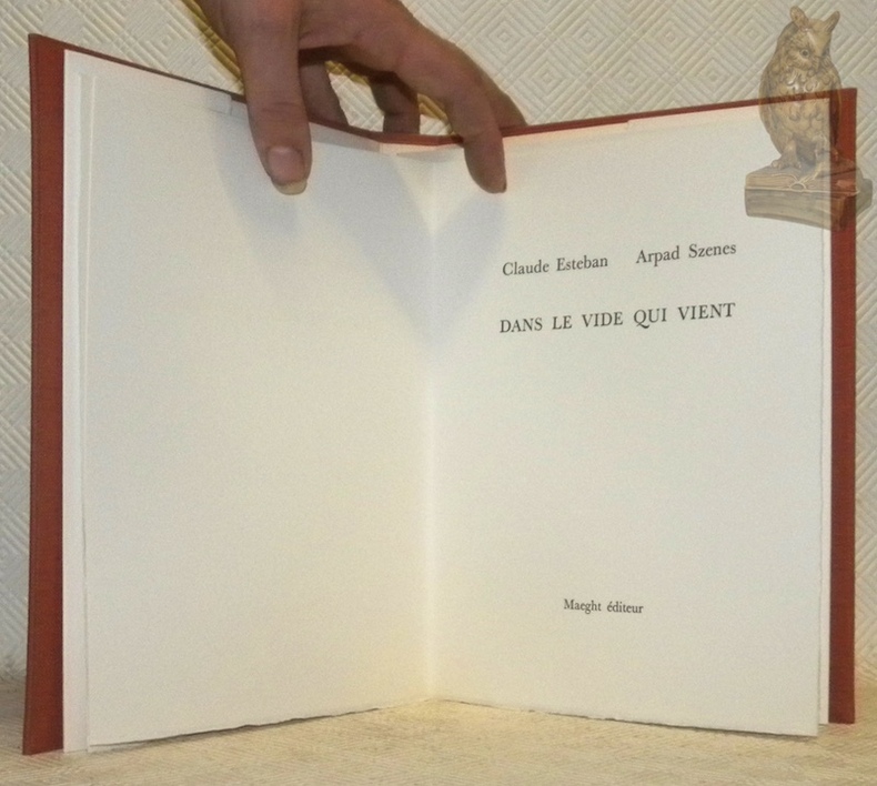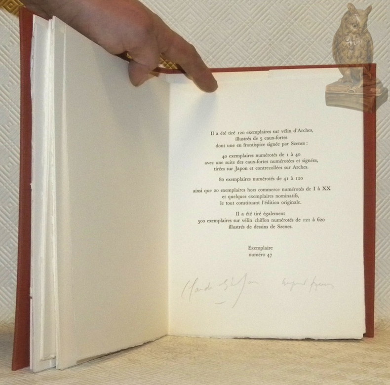 Paris, Maeght Editeur 1976, 260x195mm, 47pages, en feuille, sous couverture rempliée, chemise rigide toile et étui en toile. Un des 120 exemplaires sur papier vélin d’Arches, illustrés de 5 eaux-fortes dont une en frontispice signée par Szenes, numéroté n.° 47 / 120, constituant l’édition originale. Signés au colophon par l’auteur et l’artiste. Achevé d’imprimer le 20 février 1976 sur les presses de Robert Blanchet, typographe et de Manesse pour les gravures. Très bel exemplaire.