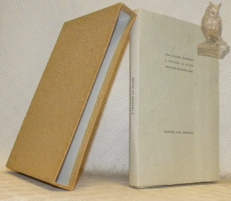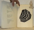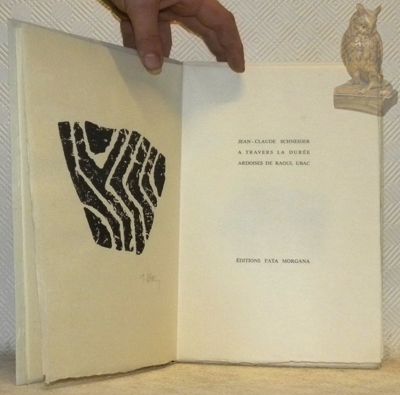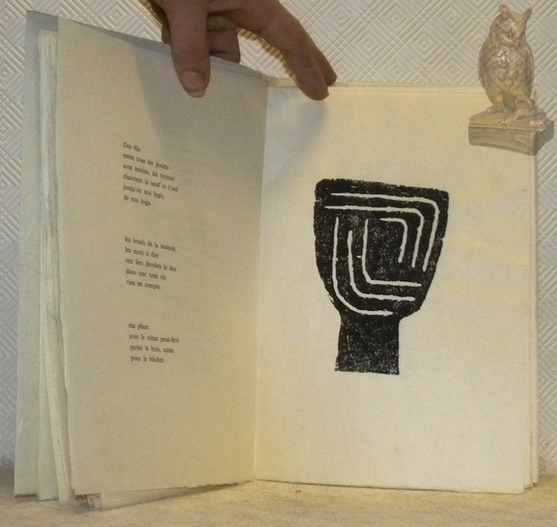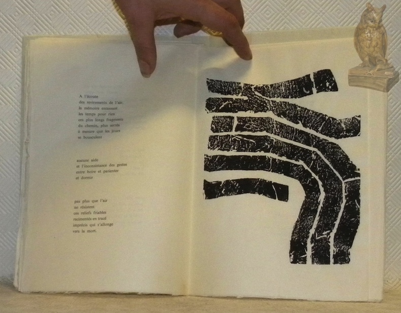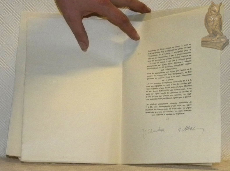 Paris, Editions Fata Morgana 1975, 290x185mm, en feuille non coupée et non paginée, sous chemise à rabats et étui rigide. Un des 60 exemplaires sur papier japon blanc Shiohara, comprenant huit linogravures, et huit gravures sur ardoises tirées à la main directment sur la pierre, numéroté n.° 31 / 60. Signés au colophon par l’auteur et l’artiste. Composée ent Times romain de corps 12, mise en page par Bruno Roy, et imprimée en janvier 1975 par l’Imprimerie de la Charité à Montpellier pour le texte et les linogravures, et par le peintre lui-même pour les gravures sur ardoise. Très bel exemplaire.