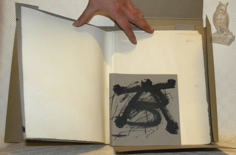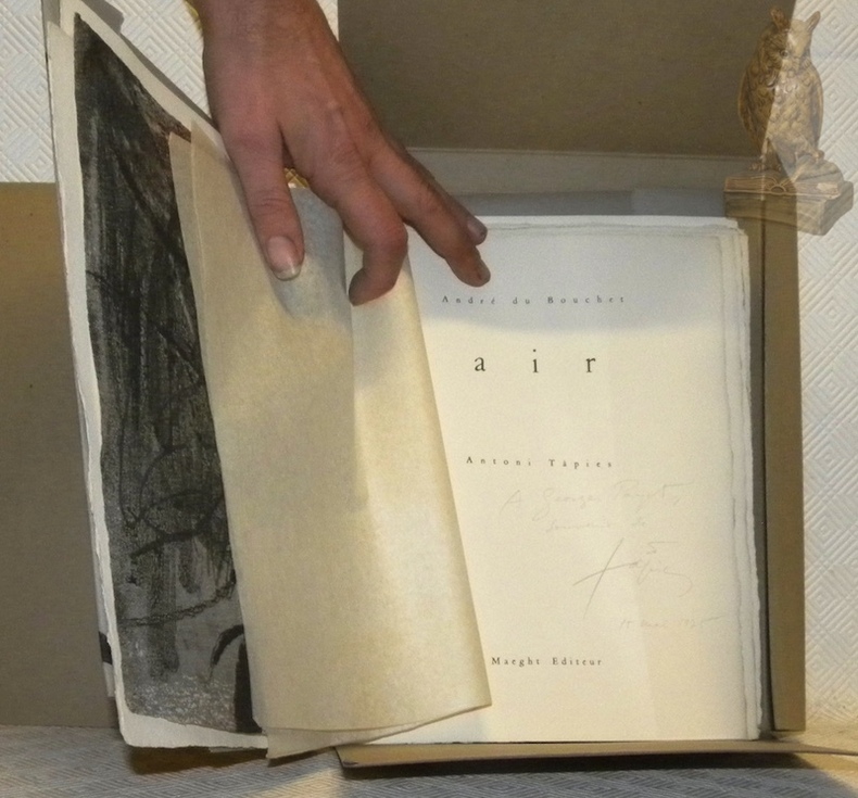 Paris, Maeght Editeur 1971, 300x235mm, en feuille, sous couverture rempliée et cartonnage illustré. Edition originale achevée d’imprimer le 30 octobre 1971 sur les presses de l’imprimerie Union à Paris. Les presses d’Arte, Adrien Maeght, ont tiré les eaux-fortes et lithographies originales d’Antoni Tàpies. Un des 150 exemplaires sur papier d’Auvergne à la main du Moulin Richard de Bas, numéroté n.° 88 / 150, signés au colophon par l’artiste et l’auteur. Hommage et signature de l’artiste avec date (15 mai 1975) Antoni Tàpies sur la page de titre. Très bel exemplaire.