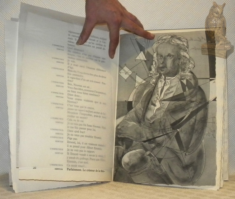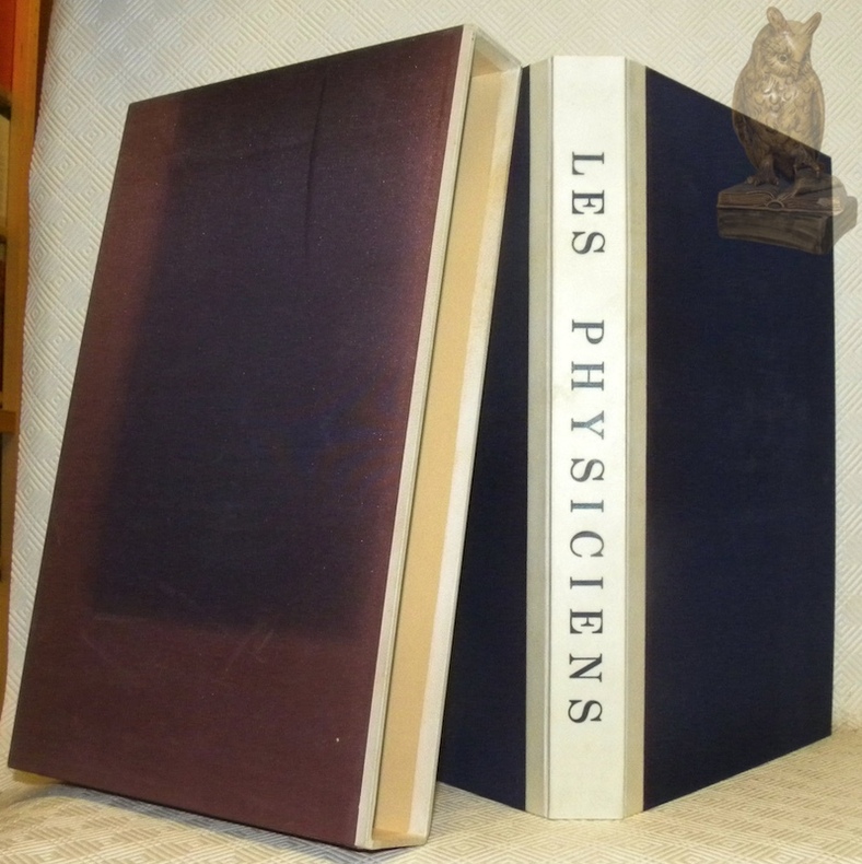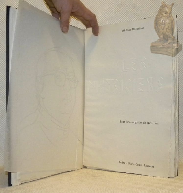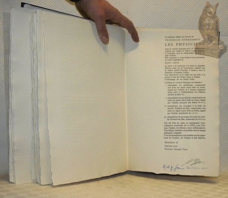 Lausanne - Zürich, André et Pierre Gonin 1969, 385x250mm, 108pages, en feuille, couverture rempliée, sous chemise demi-parchemin avec plat en papier soie, aussi papier soie pour l’emboitage. Un des 95 exemplaires sur papier auvergne à la main du moulin Richard-de-Bas, numéroté n.° 58 / 112. La présente édition de l’oeuvre de Friedrich Dürrenmatt Les Physiciens, dans la version française de J.-P. Porret a été réalisée par André et Pierre Gonin, éditeurs à Lausanne, avec la collaboration amicale de Jean Graven. Elle comporte 12 eaux-fortes et une couverture en relief originales de Hans Erni. Le texte a été composé à la main en caractère Plantin corps 18, et l’impression réalisée par le maître André Kundig, à Genève, sous la direction d'Auguste Griess. Les eaux-fortes et le relief ont été tirés à la presse à bras par Pietro Sarto, à Villette. L’emboîtage est de Roger Veihl.Signés au justificatif de tirage par les éditeurs, l’auteur et l’artiste. Très bel exemplaire.