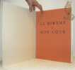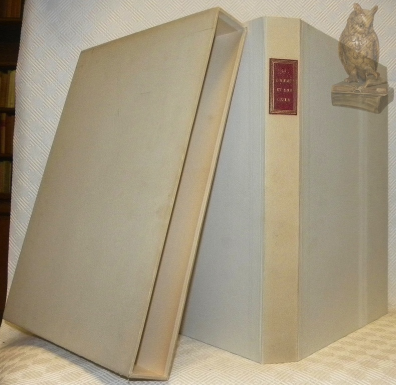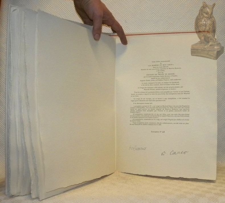 Genève, Editions du Milieu du Monde 1943, 400x300mm, 187pages, en feuille, couverture rempliée, sous chemise cartonné avec pièce de titre et encadrements doré, sous emboitage cartonné. Un des 270 exemplaires sur papier vergé d’Ingres pur chiffon à la forme de Guarro Casas, numéroté n.° 208 / 299. Cette édition monumentale de “La bohème et mon coeu” dans son texte définitif, illustrée de onze eaux-fortes originales de Maurice Barraud, a été établie, pour les Editions du Milieu du Monde, par le maître-imprimeur André Kundig, à Genève, assisté de ses collaborateurs Auguste Griess, prote, et Frédéric Froesch, chef conducteur. Le texte, composé à la main, en italique de Garamond, a été tiré en deux couleurs, dans le format in-folio jésus. Le tirage des estampes a été exécuté, sur ses propres presses, par Reynold Disteli, peintre et graveur, à Genève. Signés au justificatif de tirage par l’auteur et l’artiste. Très bel exemplaire.