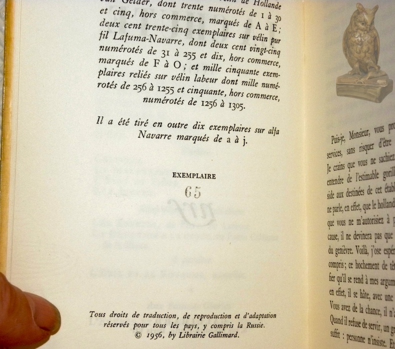 Paris, Librairie Gallimard 1956, 185x120mm, 169pages, broché. Un des 235 exemplaires de l’édition originale sur papier vélin pur fil Lafuma-Navarre, numéroté n.° 65 / 255. Papier cristal d’origine conservé. Bel exemplaire.